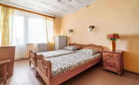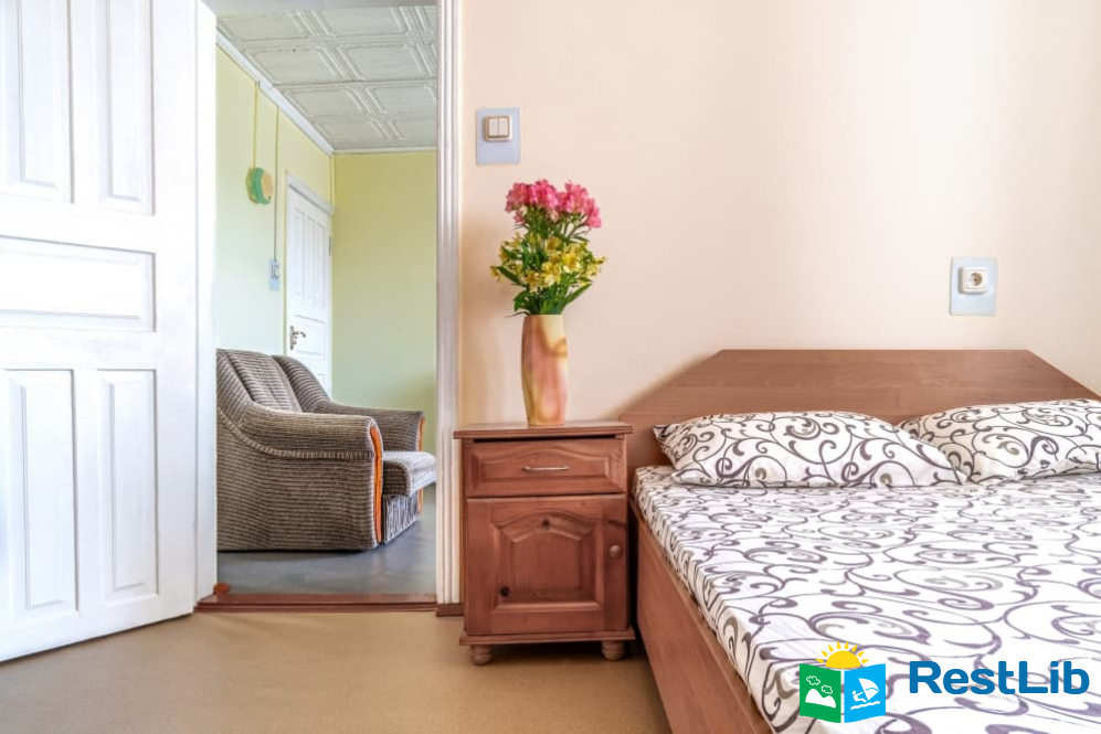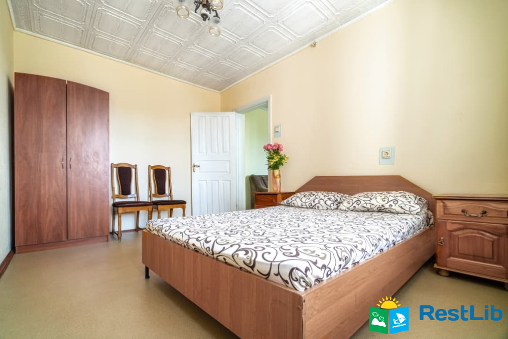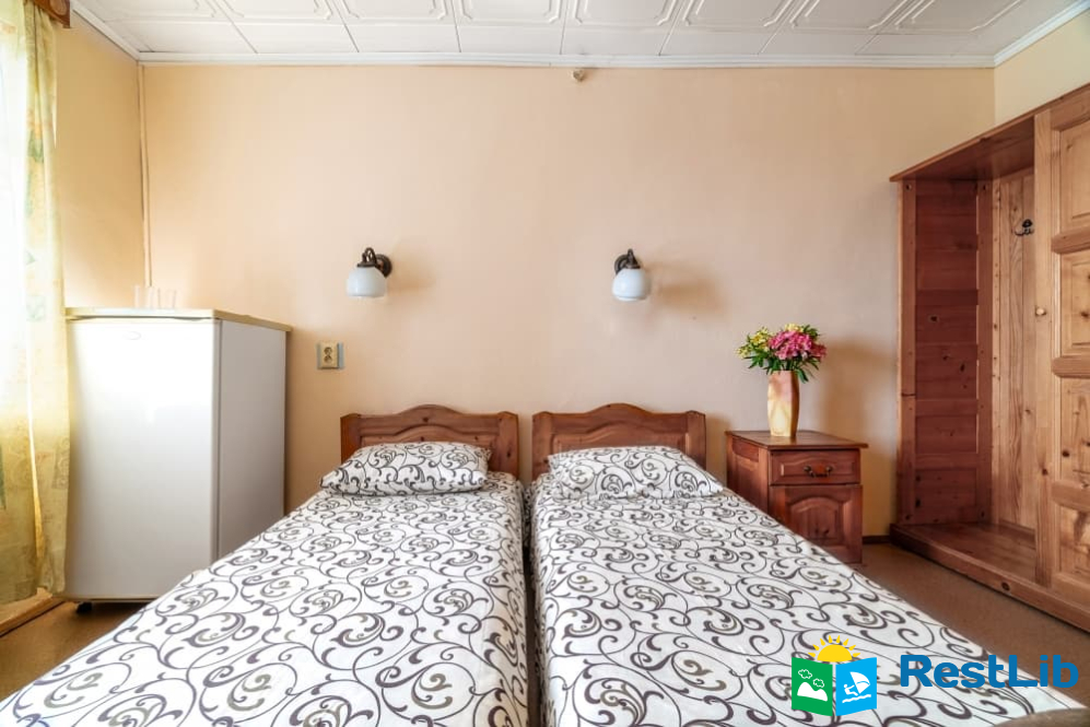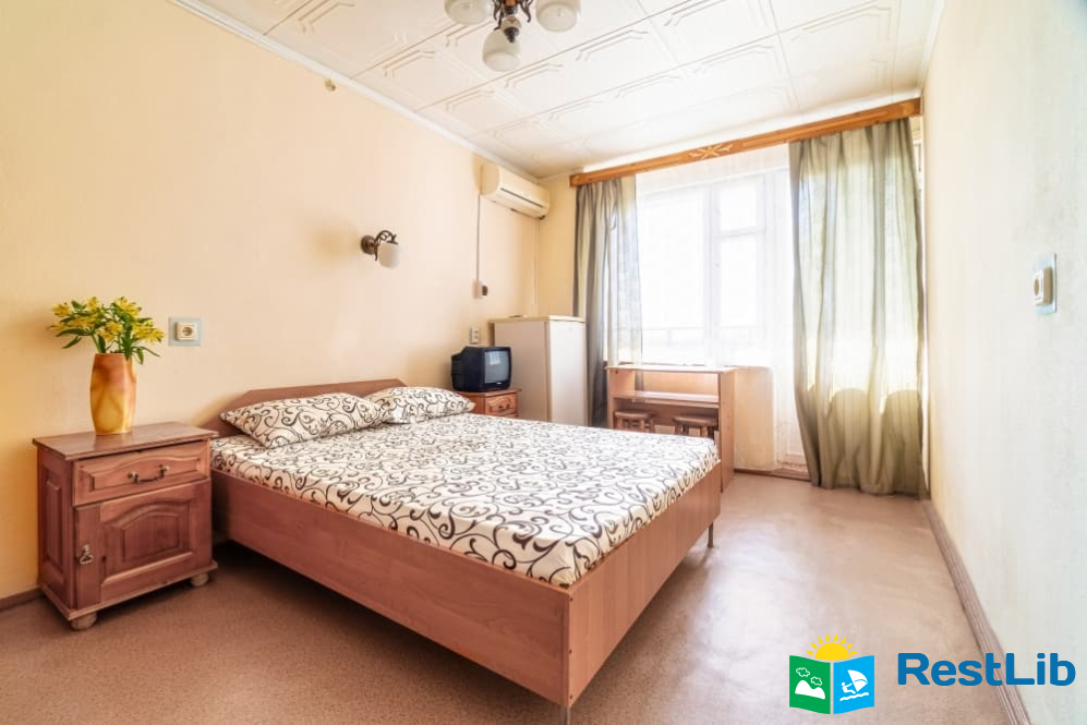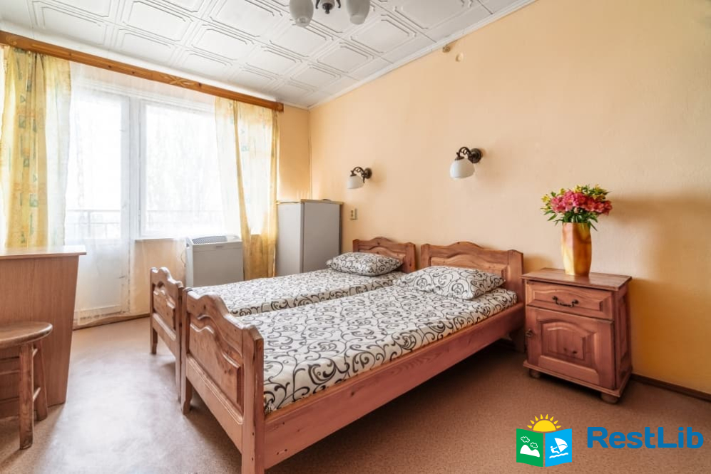 В номере есть две односпальных либо одна двуспальная кровати, шкаф, стол, тумбочки, холодильник. Также в каждом номере санузел, с горячей и холодной водой. Площадь 23 м2