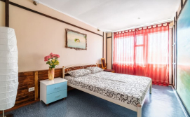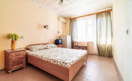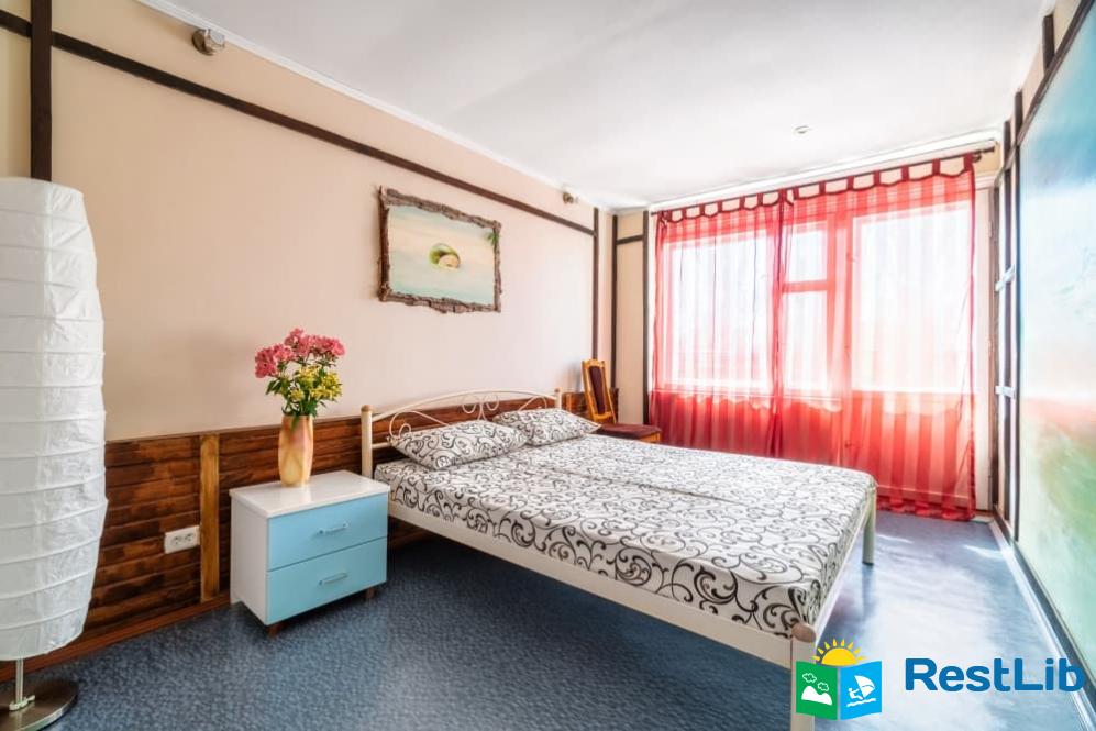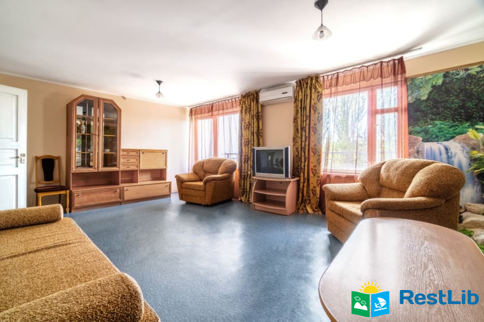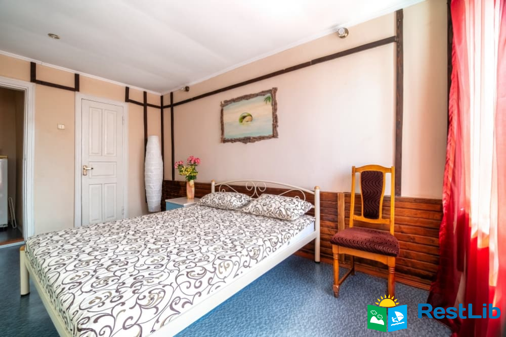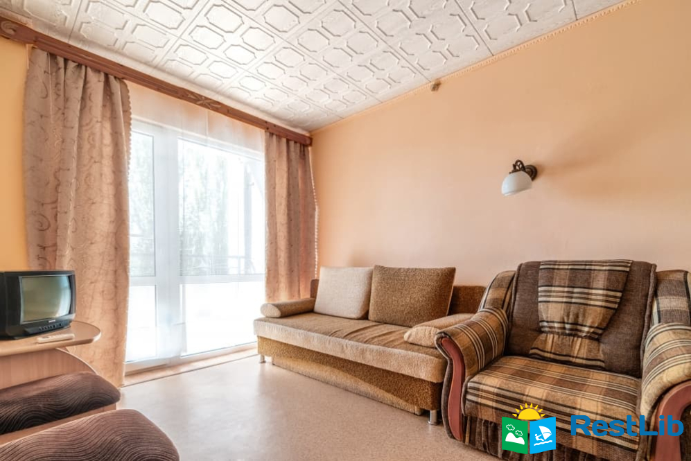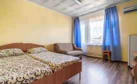 Большой однокомнатный номер, рассчитанный на семью из 2-3-х человек.В номере есть двуспальная кровать, небольшой диван либо кресло-кровать, шкаф, стол, тумбочки, холодильник, телевизор и кондиционер. Также в номере санузел с горячей и холодной водой. Шкаф или гардероб с вешалкой.Бесплатные туалетно-косметические принадлежности. Площадь номера 30 м2