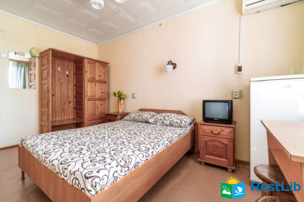 В номере есть две односпальных либо одна двуспальная кровати, шкаф, стол, тумбочки, холодильник,кондиционер. Также в есть санузел, с горячей и холодной водой. Площадь номера 22 м2.