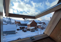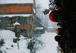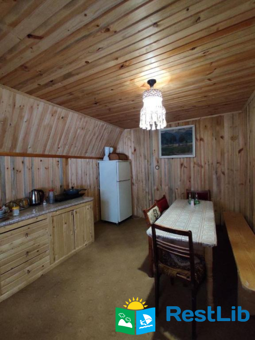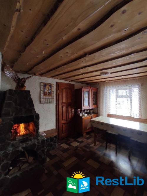 - кухня-їдальня (газова плита, холодильник, електрочайник, посуд, мийка, обідній стіл, камін);