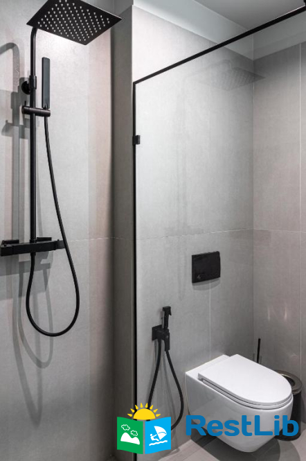 У ванній кімнаті: душ, туалет, рушникосушка, фен, рушники, косметичні засоби, халати, капці