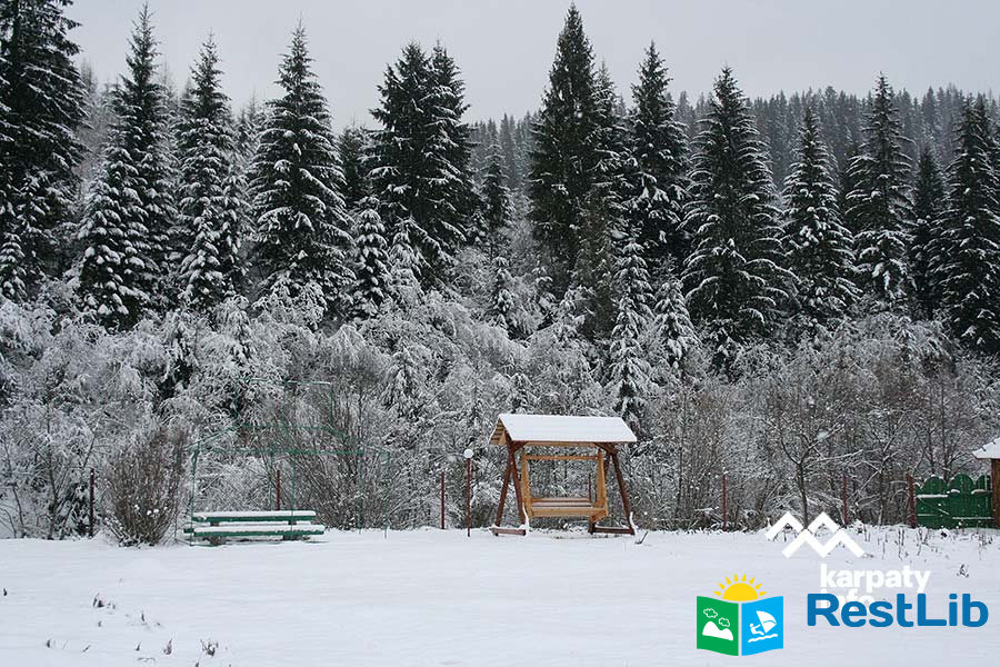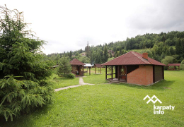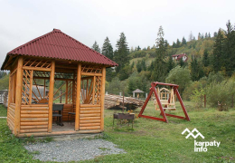 Біля будинку сад, альтанка з мангалом, колиба, поруч ліс.