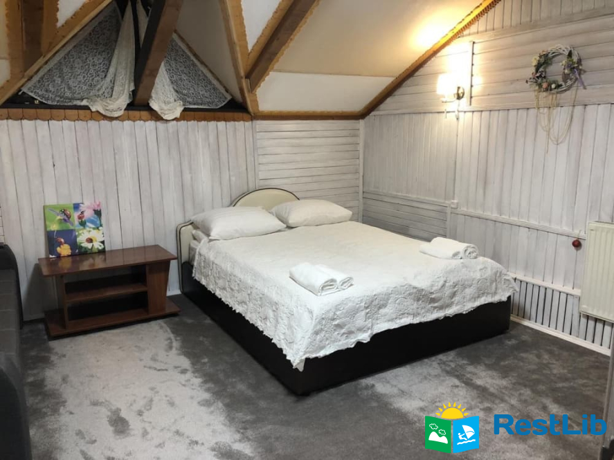 Другий поверх з окремим входом з вулиці на 4-8осіб в будиночку з сауною. Орієнтовну вартість вказано за 8осіб. Точну ціну на ваші дати уточнюйте за телефоном. Можливе поселення меншої кількості осіб за меншу вартість. - На поверсі: кухня (все необхідне приладдя), дві кімнати на 2-4особи (парно зіставлено односпальні ліжка), санвузол (умивальник, душ, туалет).