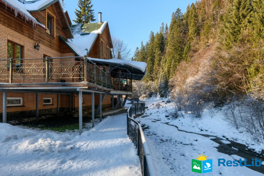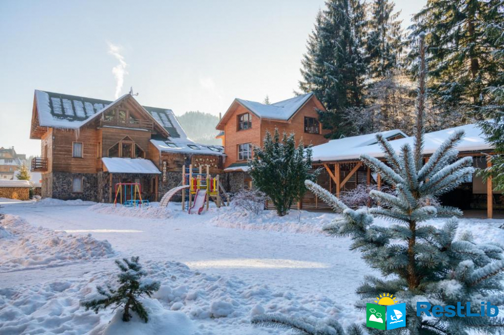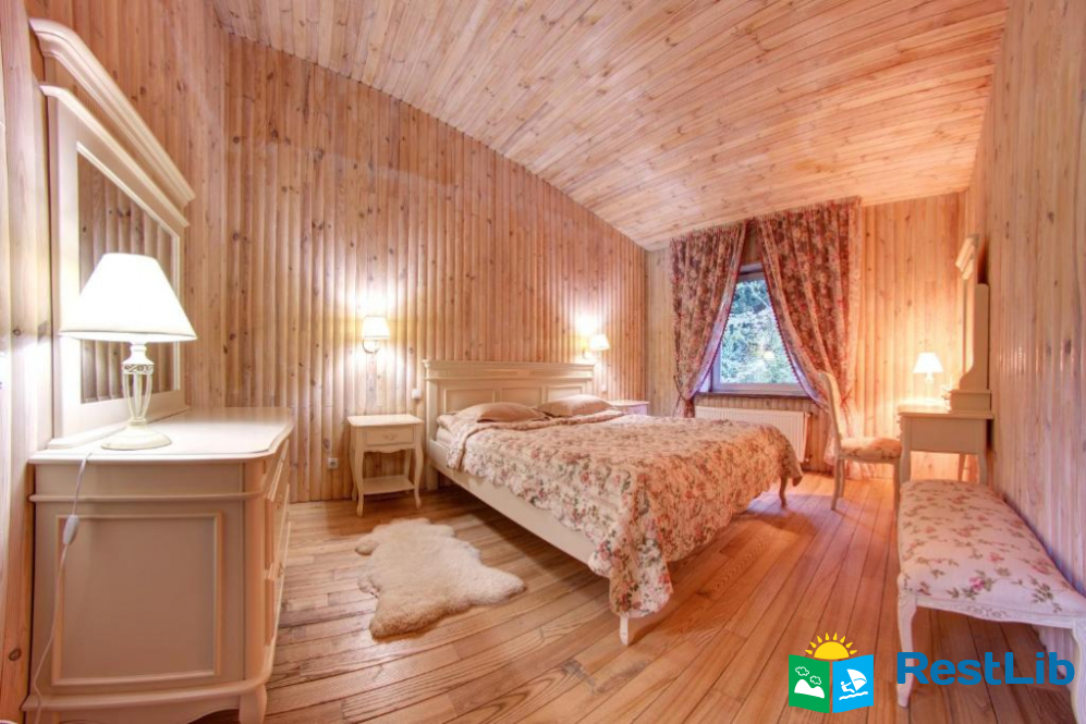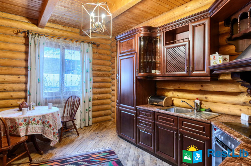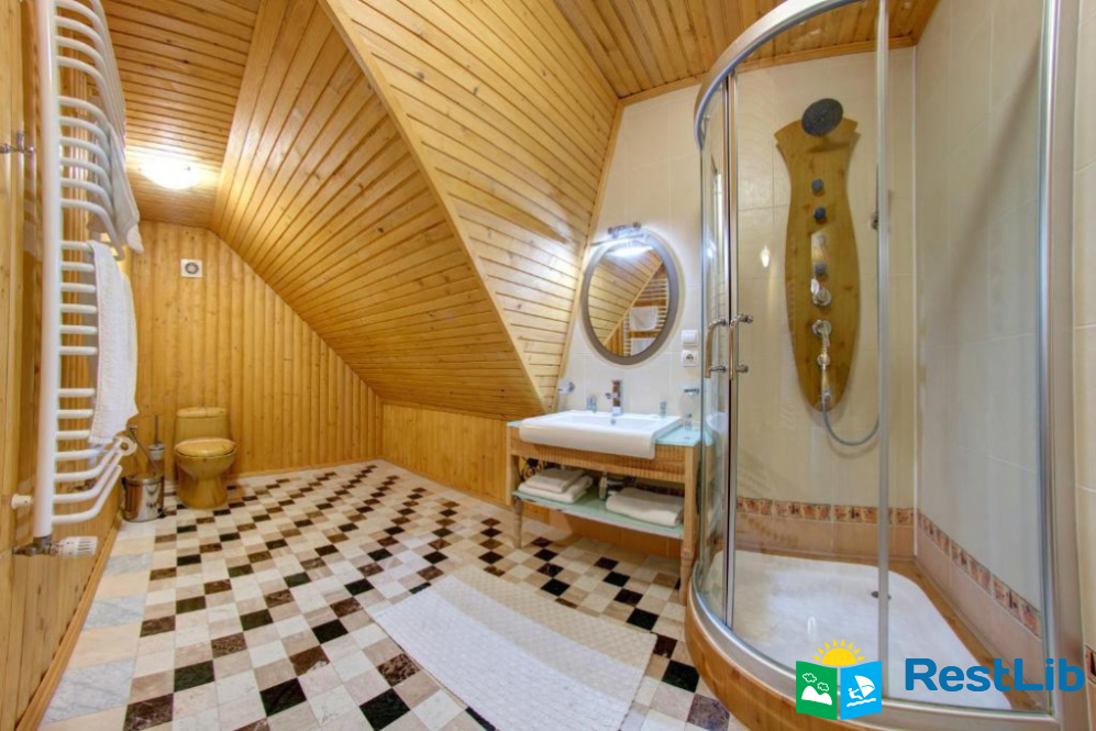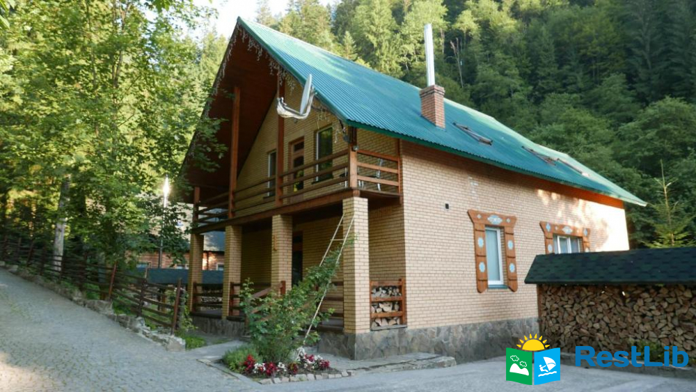 Окремий двоповерховий будинок з італійським і національним декором для відпочинку великою компанією друзів. Наявна простора кухня з усім необхідним обладнанням. На першому поверсі є кімната відпочинку, з плазмовим телевізором і каміном. У будинку так само знаходиться два санвузли, з обробкою з мармуру.