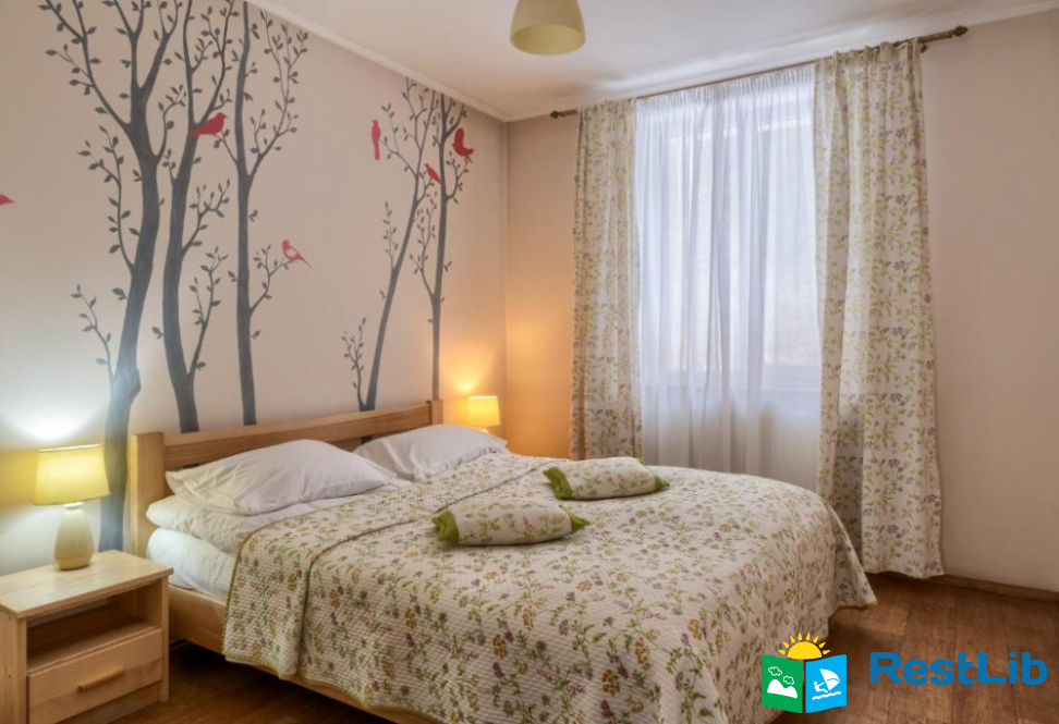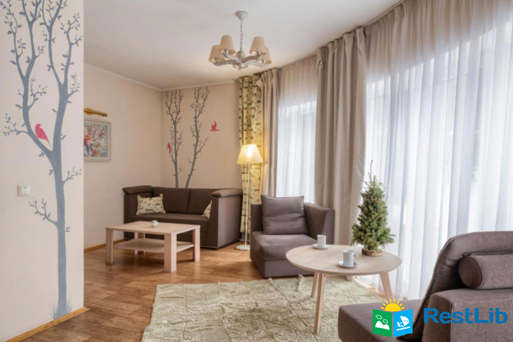 Затишний номер складається з вітальні і двох спалень. Інтер’єр продуманий для комфортного розміщення меблів та приладів.