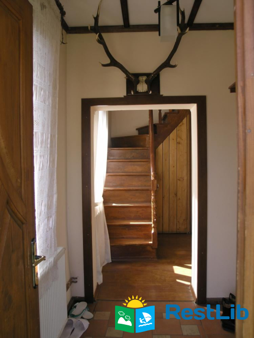 На втором этаже: 3 двухместных номера (двуспальная кровать, вешалка для одежды, телевизор, санузел в каждом номере (душ, туалет, умывальник), в одном из номеров есть дополнительное спальное место.1 четырехместный номер (двуспальная кровать, телевизор, санузел ( душевая кабина, унитаз, умывальник). Холл со столиком и диваном.