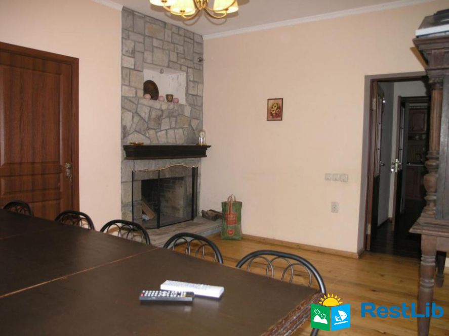 На первом этаже: каминный зал (телевизор, обеденный стол), кухня (газовая плита, микроволновая печь, холодильник, электрочайник, посуда, мойка), четырехместный номер (двуспальная кровать, раскладной диван, вешалка для одежды, телевизор, санузел - (душевая кабина , туалет, умывальник).