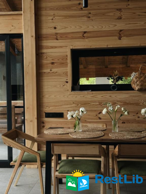 Одразу біля шале розташована обідня гриль-зона, зі столом, мангалом та усім потрібним приладдям для приготування їжі на вогні.