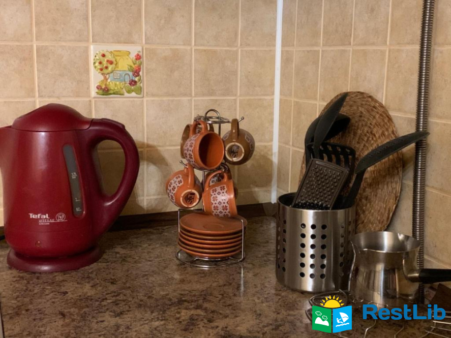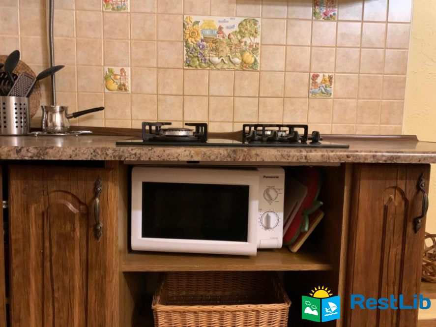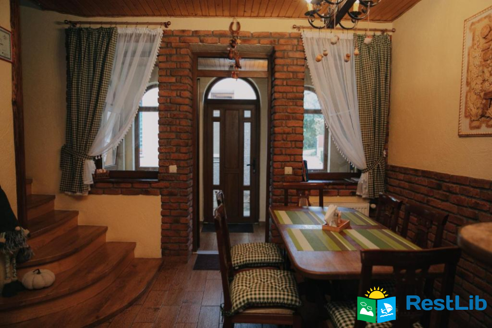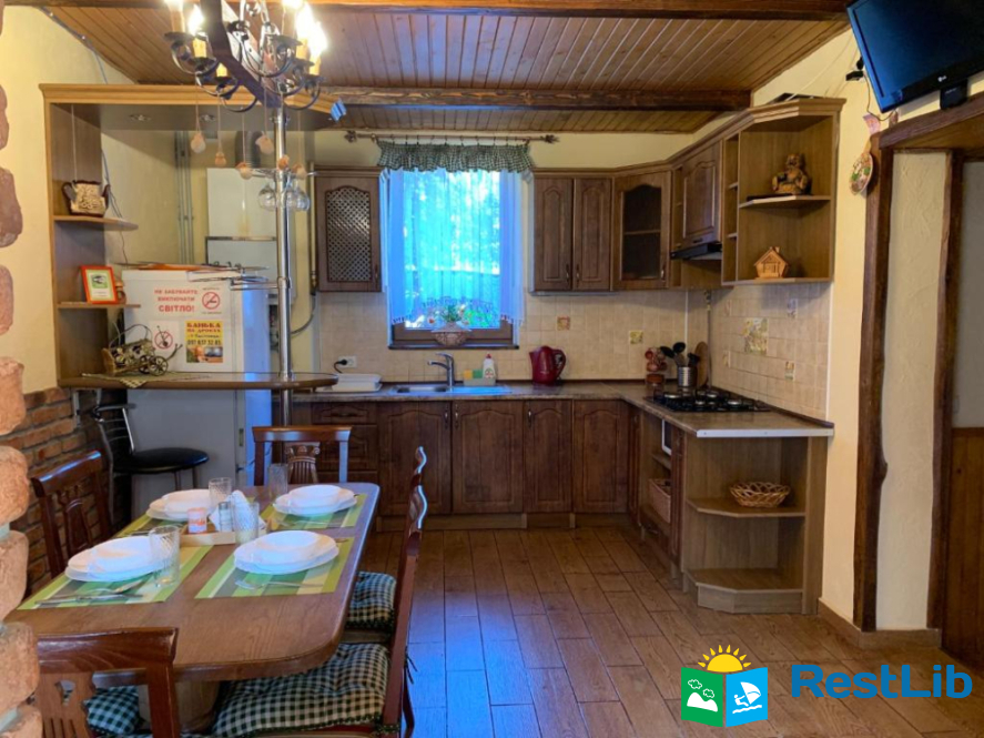 На першому поверсі розміщена кухня – столова з усім необхідним приладдям для самостійного приготування їжі, спальня з двоспальним ліжком та ванною кімнатою.