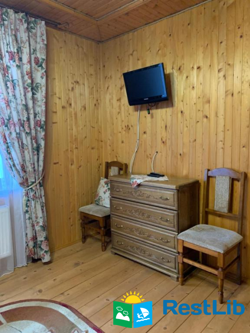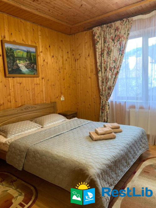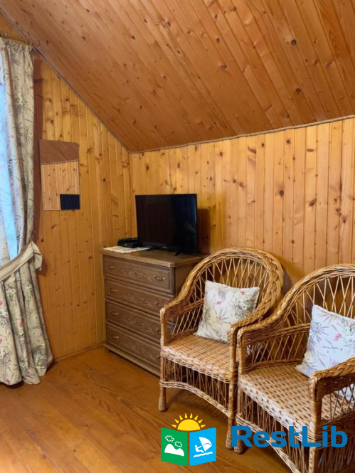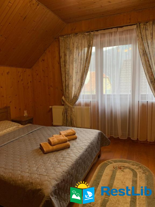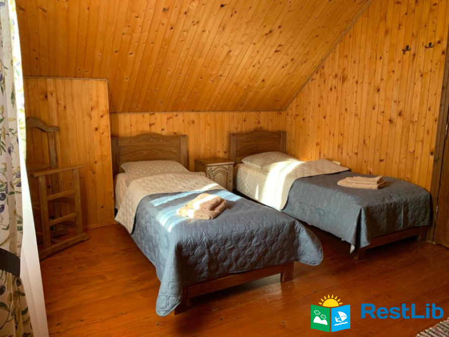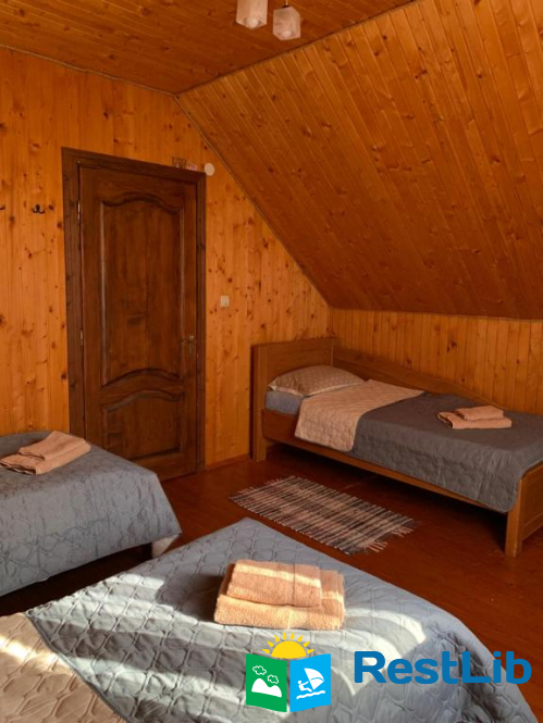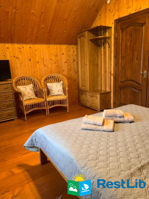 На другому поверсі знаходяться дві спальні кімнати та ванна кімната в коридорі. У всіх спальних кімнатах – дубові меблі, телевізори з плоским екраном та супутниковими каналами. У ванних кімнатах та на кухні – підлога з підігрівом. В оздобленні помешкання переважають природні матеріали. На всій території безкоштовний інтернет (Wi-Fi) та парковка. Для дорослих та дітей є відпочинкова зона – альтанка, мангал, дитячий куточок, садова гойдалка.