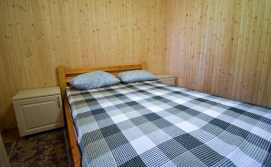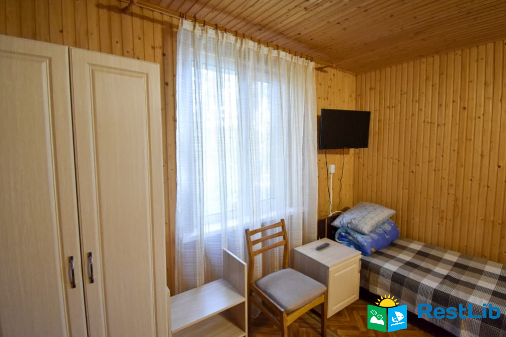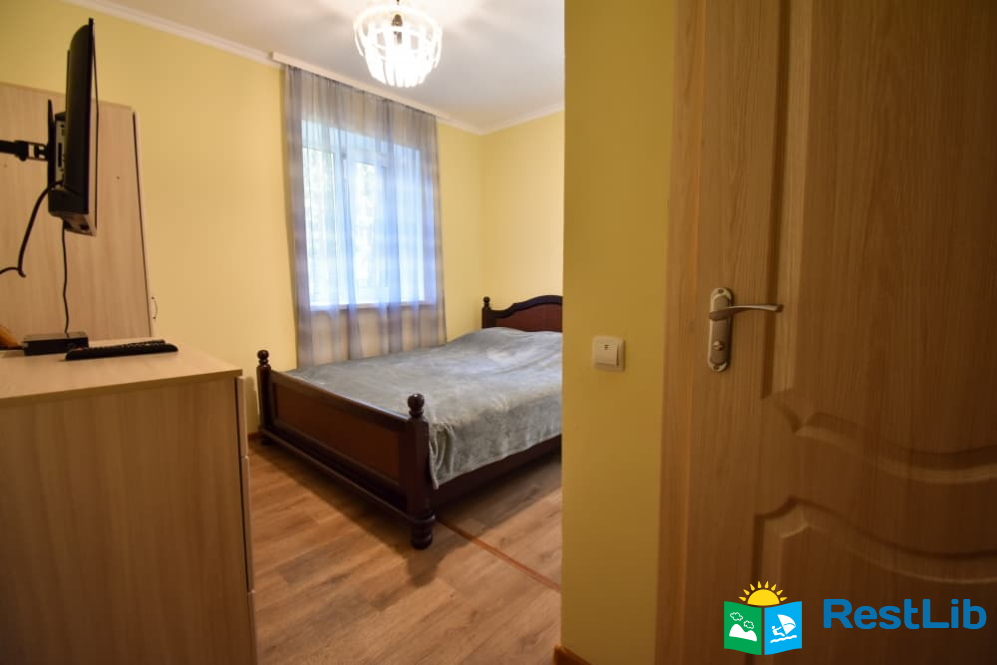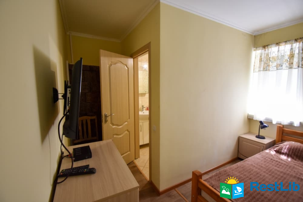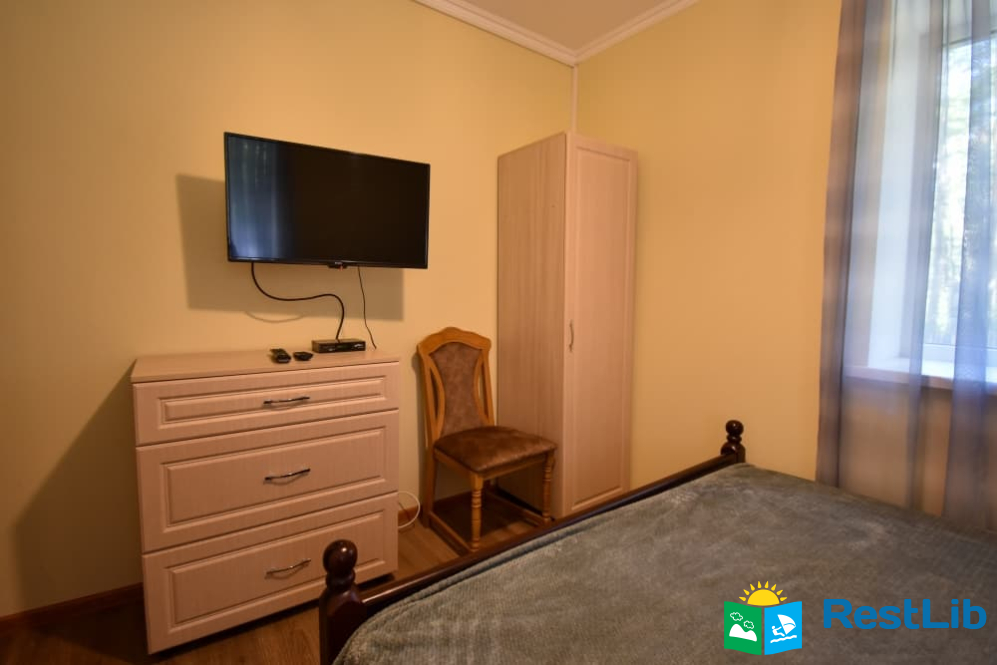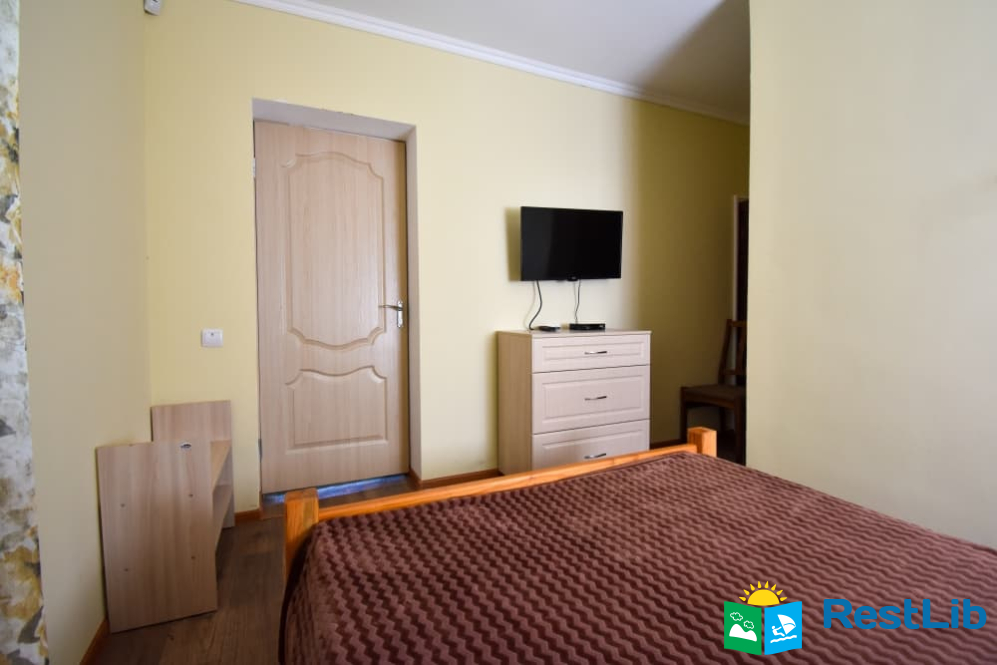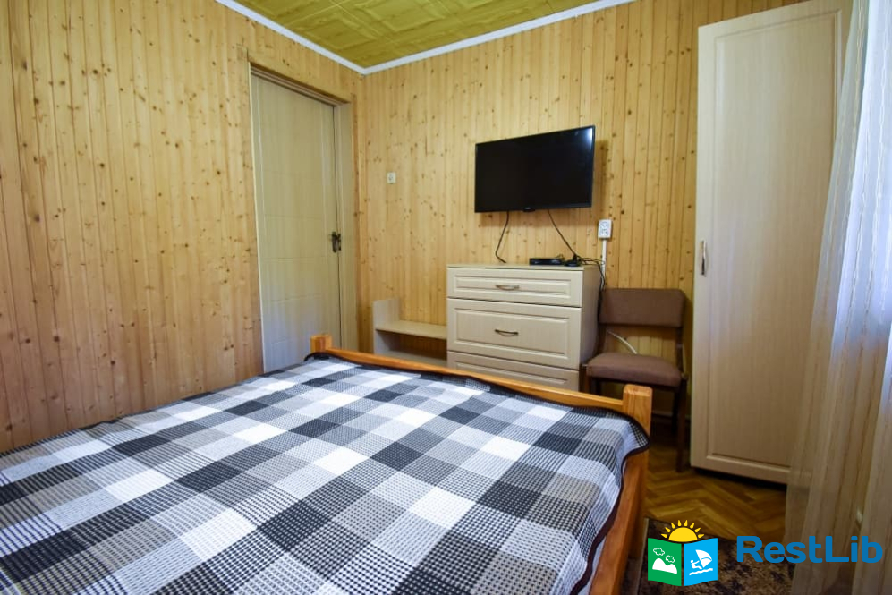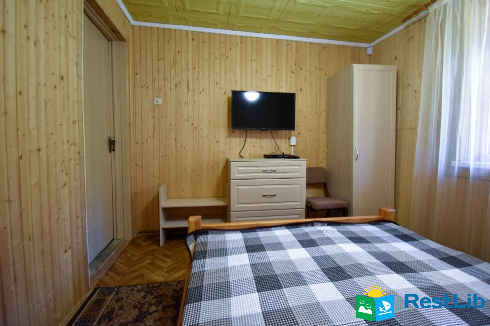 Двомісна кімната на першому поверсі у будинку. В кімнаті є власний санвузол (душ, туалет, умивальник), двоспальне ліжко, телевізор, шафа, комод, тумбочка, стілець. Кухня спільна для всього дому.