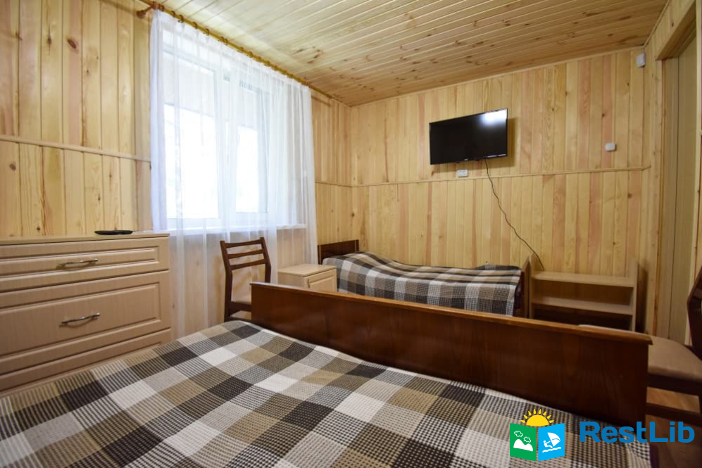 Тримісна кімната на другому поверсі у будинку. В кімнаті є двоспальне + односпальне ліжко, телевізор, шафа, комод, тумбочки, стільці, поличка для взуття. Два спільних санвузли знаходяться на поверсі. Кухня спільна для всього дому.