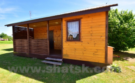 Вагончик на 4 особи. Всередині: холодильник, міні-кухня, кухонний посуд, електроплита, постільна білизна, обідня зона на терасі, 2 односпальних ліжка + 1 двоспальне