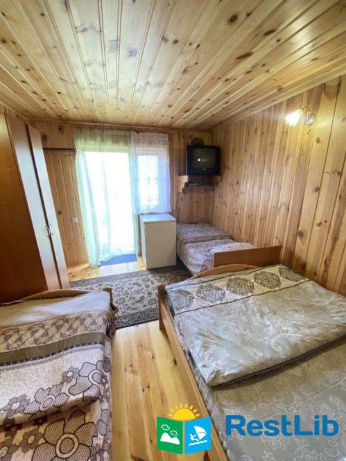 В 2 інших кімнатах 1 двоспальне і 2 односпальних ліжка, туалет з душем, телевізор, холодильник, шкафи.