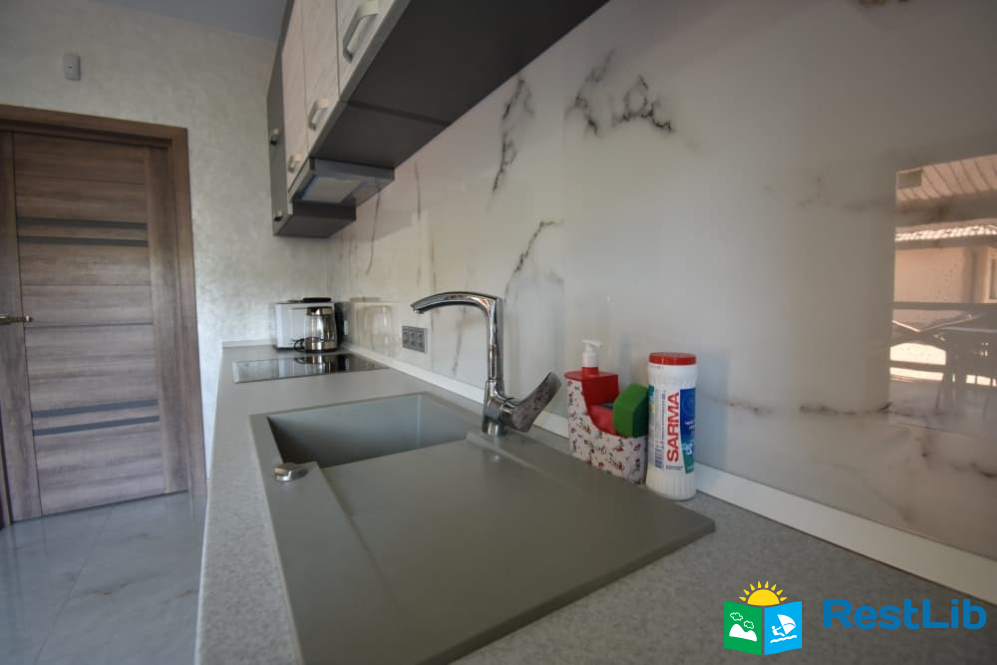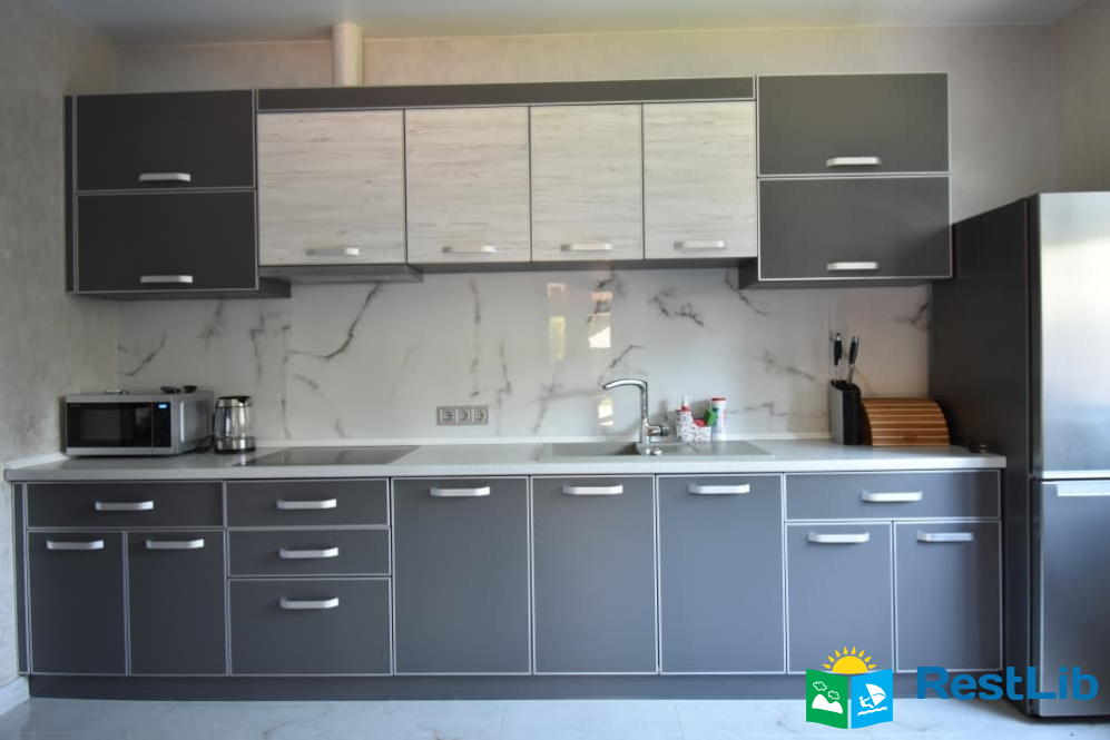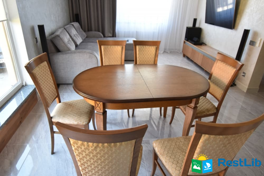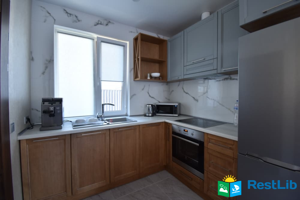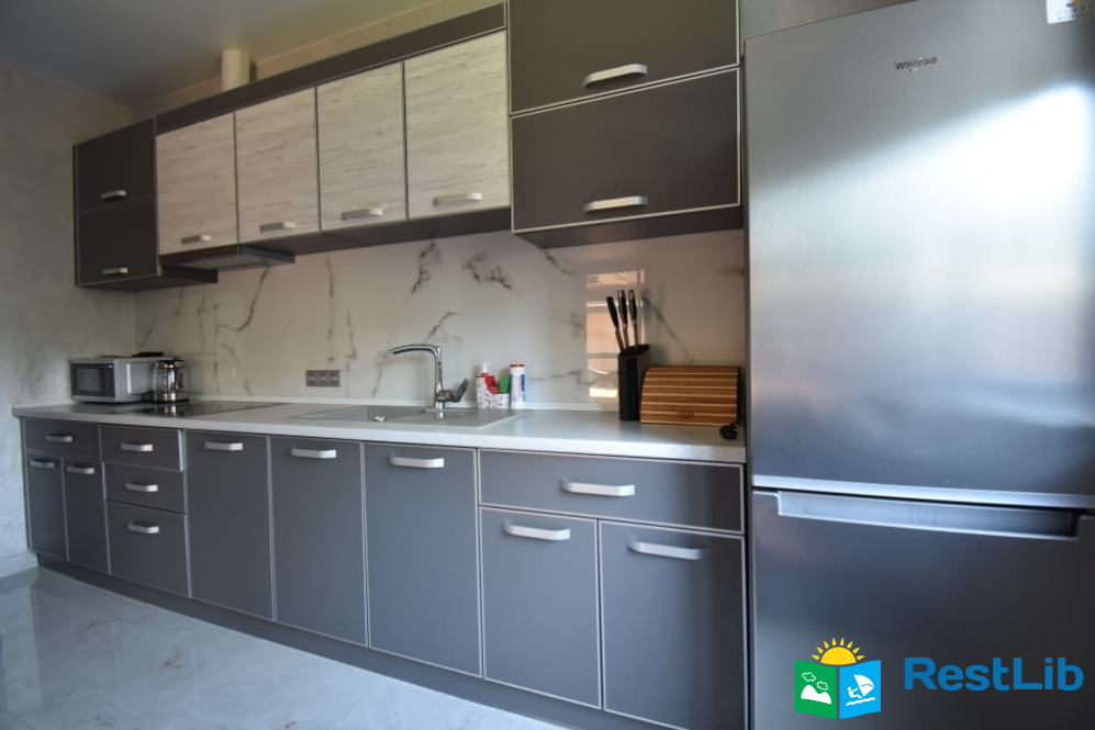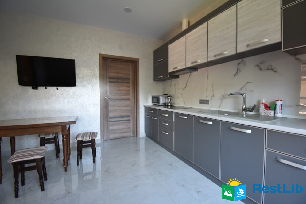 - кухня: індукційна плита, духовка, чайник, мікрохвильова піч, кавоварка, холодильник, обідній стіл та стільці.