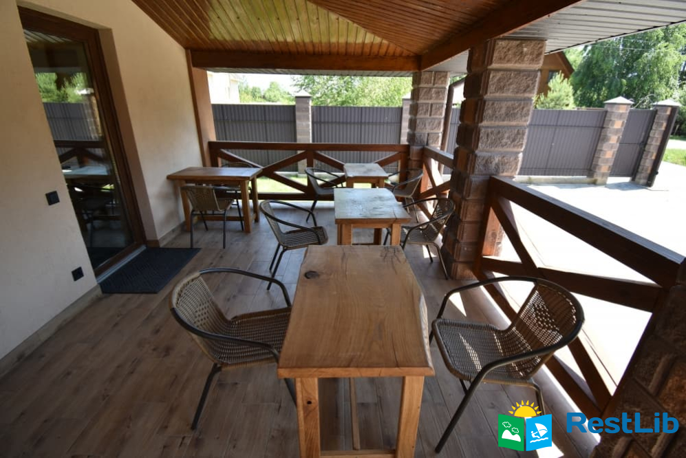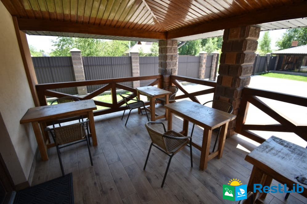 Біля входу в будинок крита тераса зі столами та плетеними кріслами.