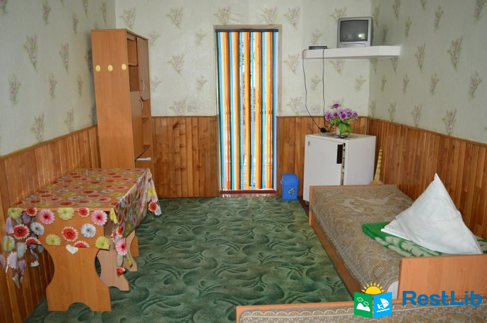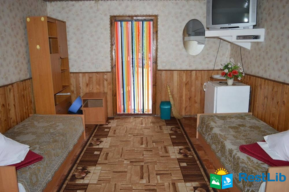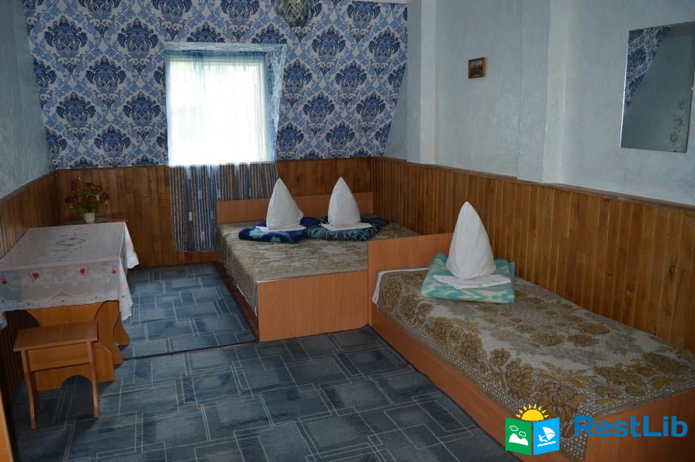 В номері є: двоспальне та односпальне ліжка, шафа, дзеркало, стіл, стільці, тумбочка, холодильник, телевізор, Wi-Fi. Туалет на вулиці. Душ на першому поверсі будинку.