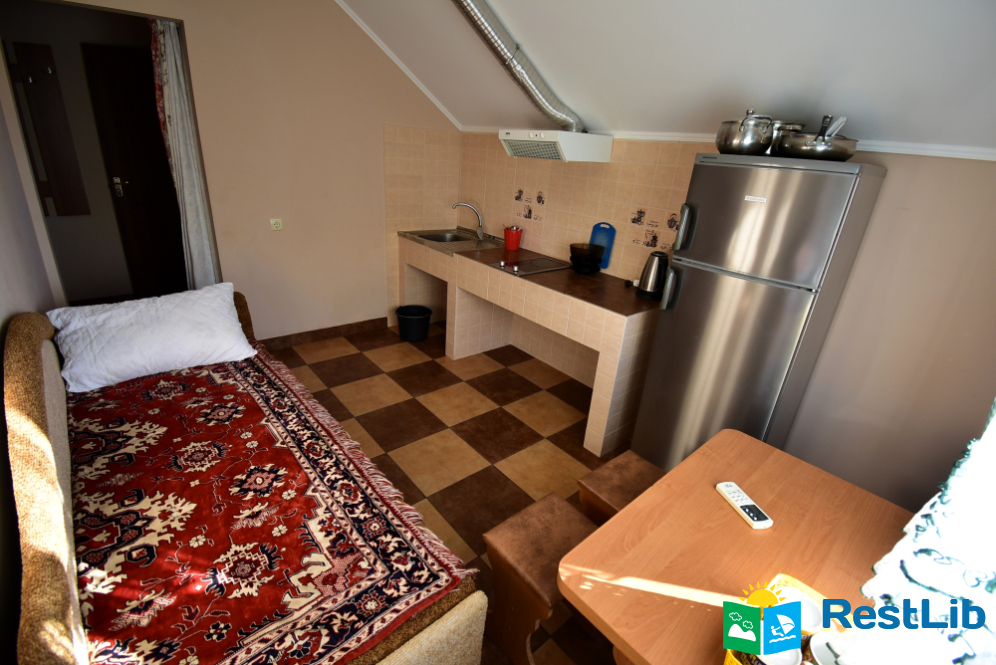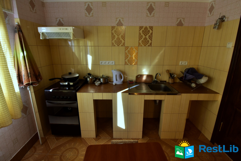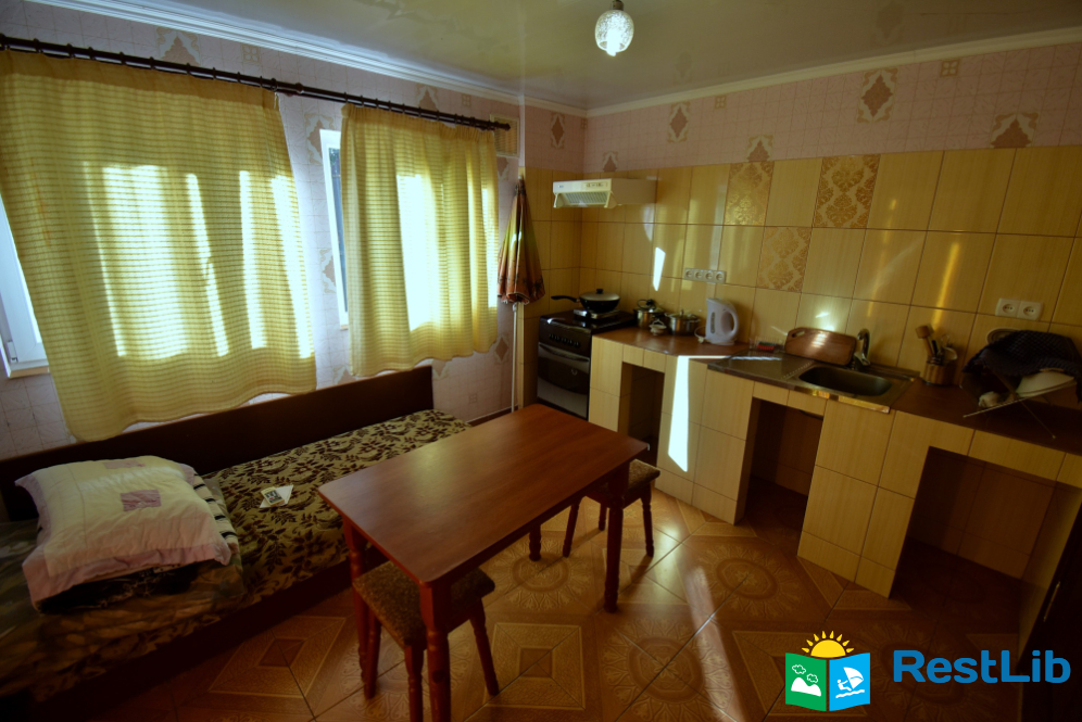 Апартамент на першому поверсі будинку №2. Власний вхід з вулиці, двомісна спальня кімнати, власний санвузол, укомплектована кухня з диванчиком (для однієї людини).