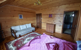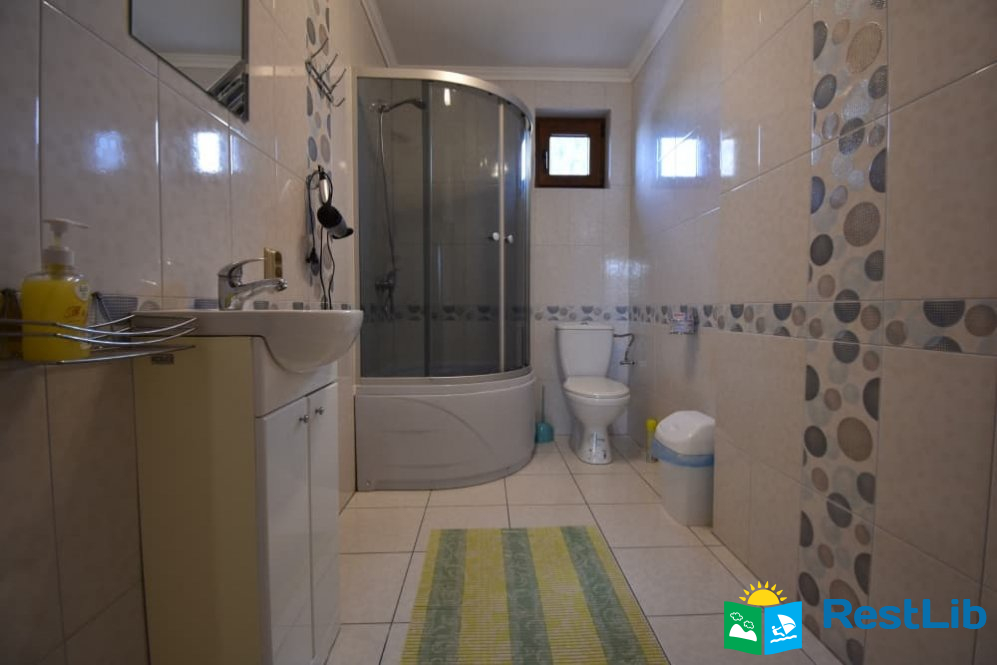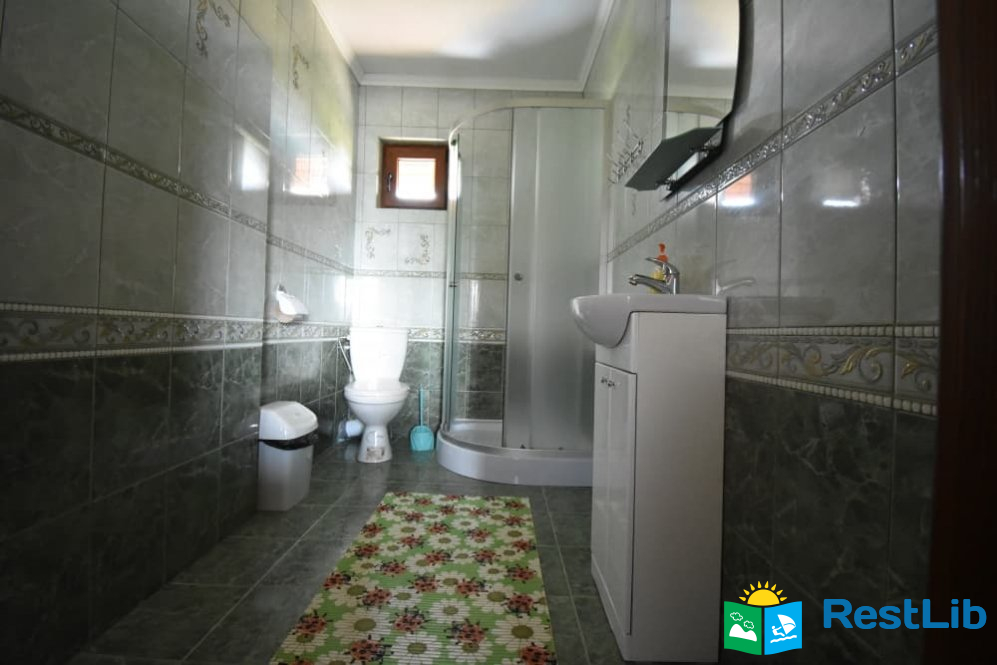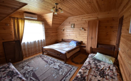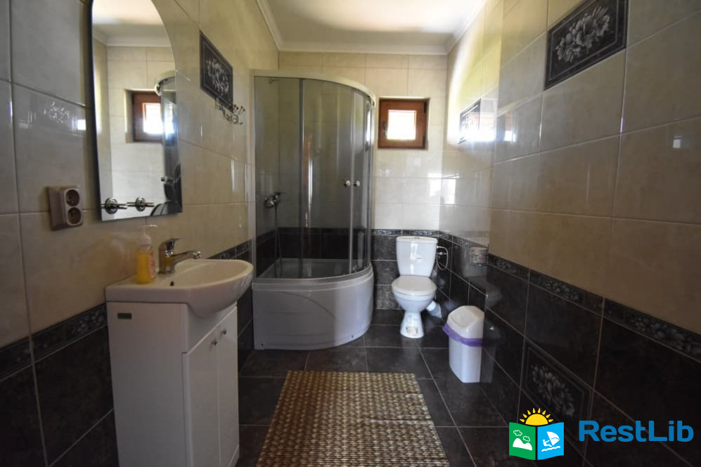 Кімната №3 на першому поверсі. У номері: кухня (кухонний гарнітур, техніка, посуд, обідній стіл), спальна кімната (двоспальне ліжко, розкладний диван, комод, шафи, телевізор, приліжкові тумби) та санвузол (душова кабіна, туалет, умивальник, фен).