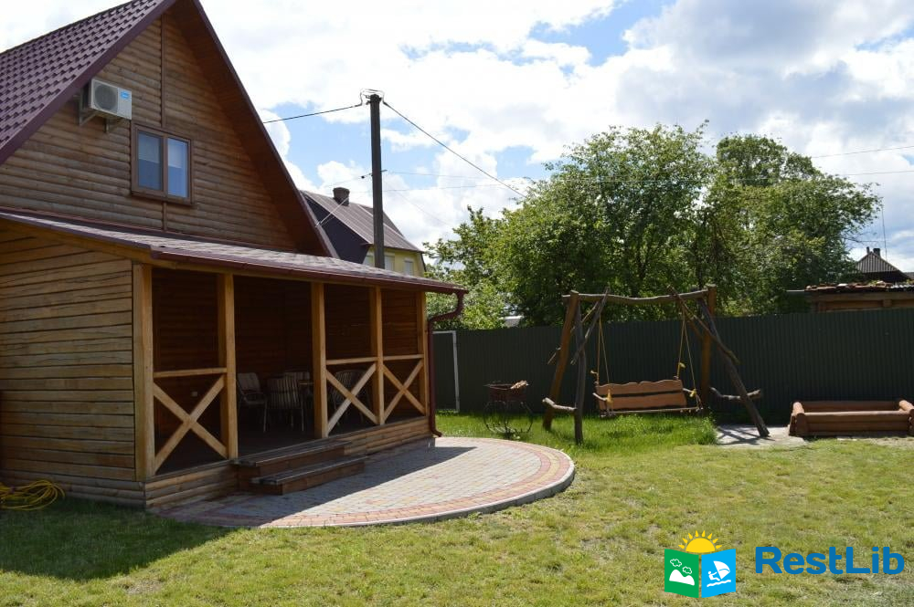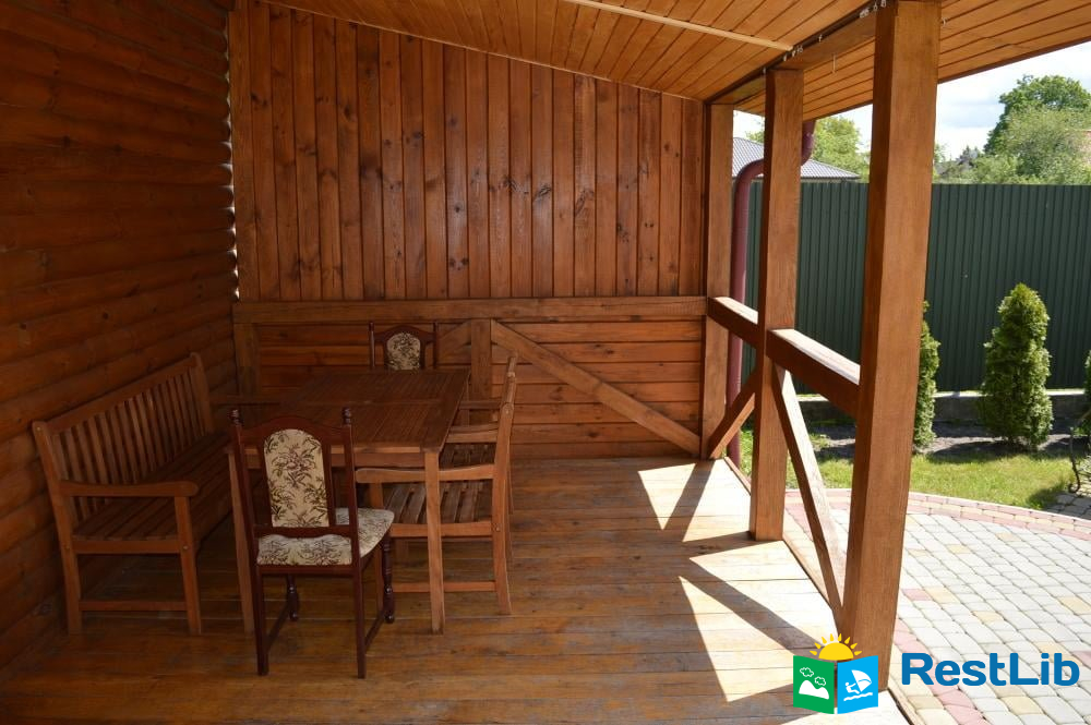 Котедж "Сієста 2" на 8 осіб має власну терасу, де стоїть стіл, стільці, свій мангал та гойдалку.