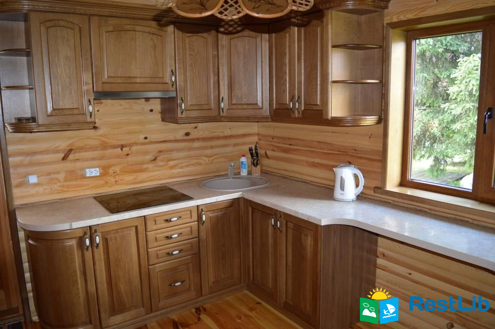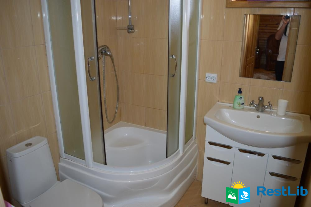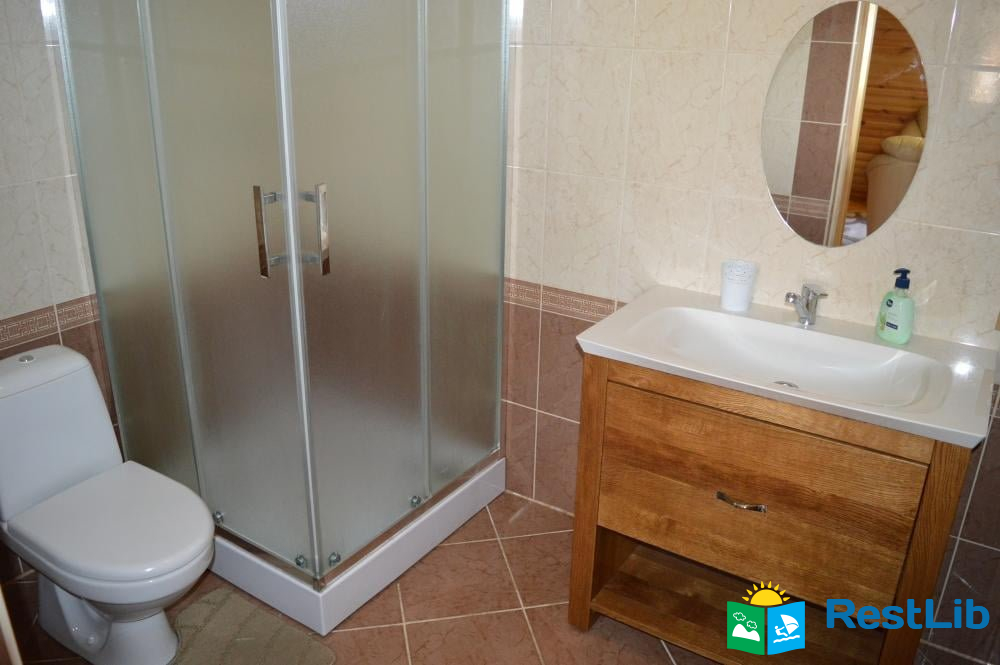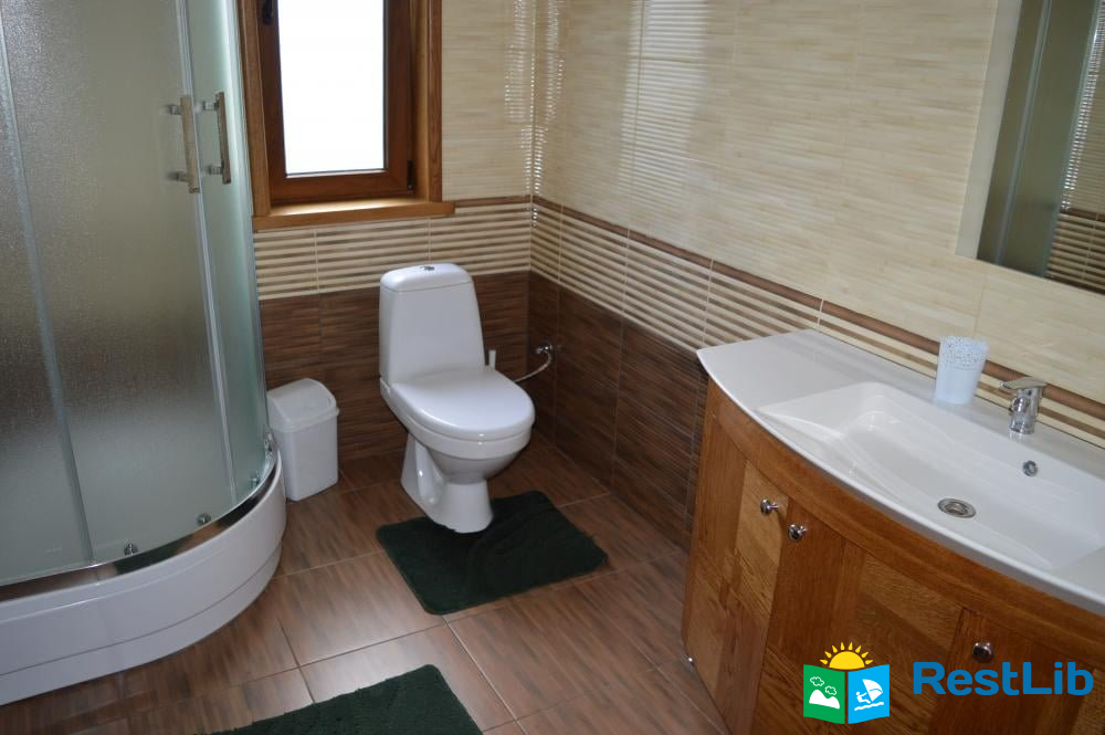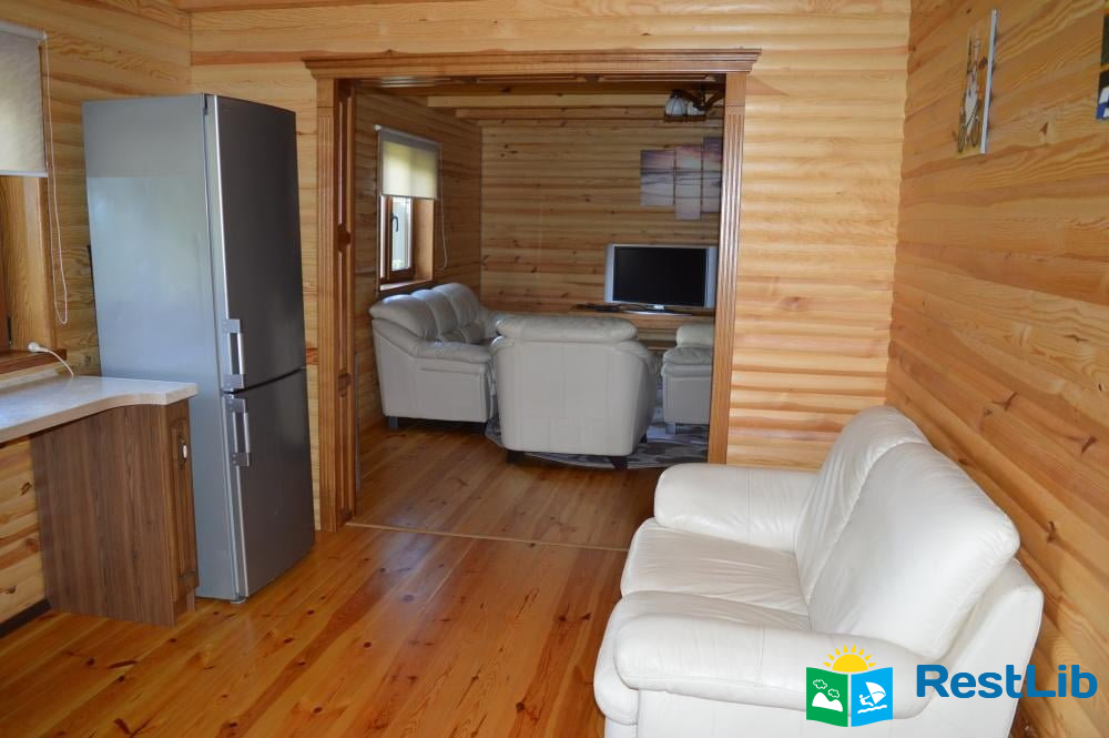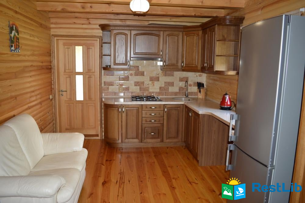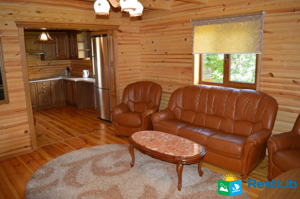 - 1-й поверх - Кухня-прихожа (кухонна гарнітура, холодильник, варочна поверхня, шкіряний диван), вітальня (стіл, шкіряні дивани, крісло, плазмовий телевізор), спальня (двоспальне ліжко, приліжкові тумби, дитяче ліжечко), санвузол (душ, туалет, умивальник, рушники).
