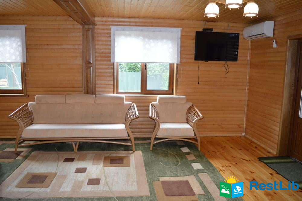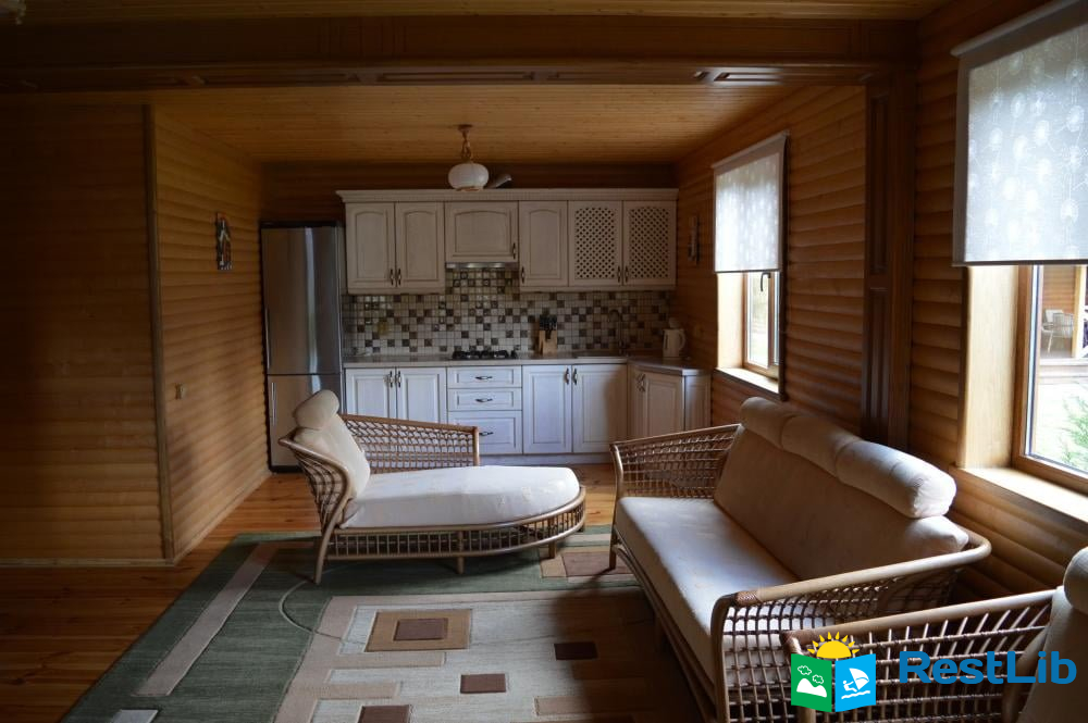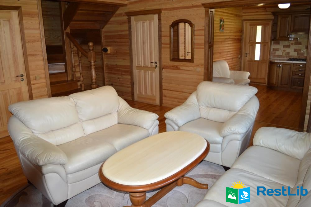 - 1-й поверх - просторий хол (кухонний куточок, плазмовий телевізор, шкіряні дивани та крісла, стіл, кондиціонер), спальня ( 2 односпальні ліжка, які стоять разом, крісло, тумба), санвузол (душ, туалет, умивальник, рушники).