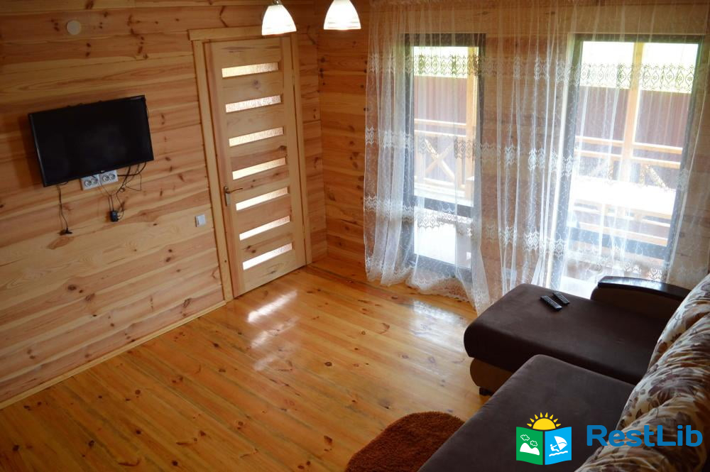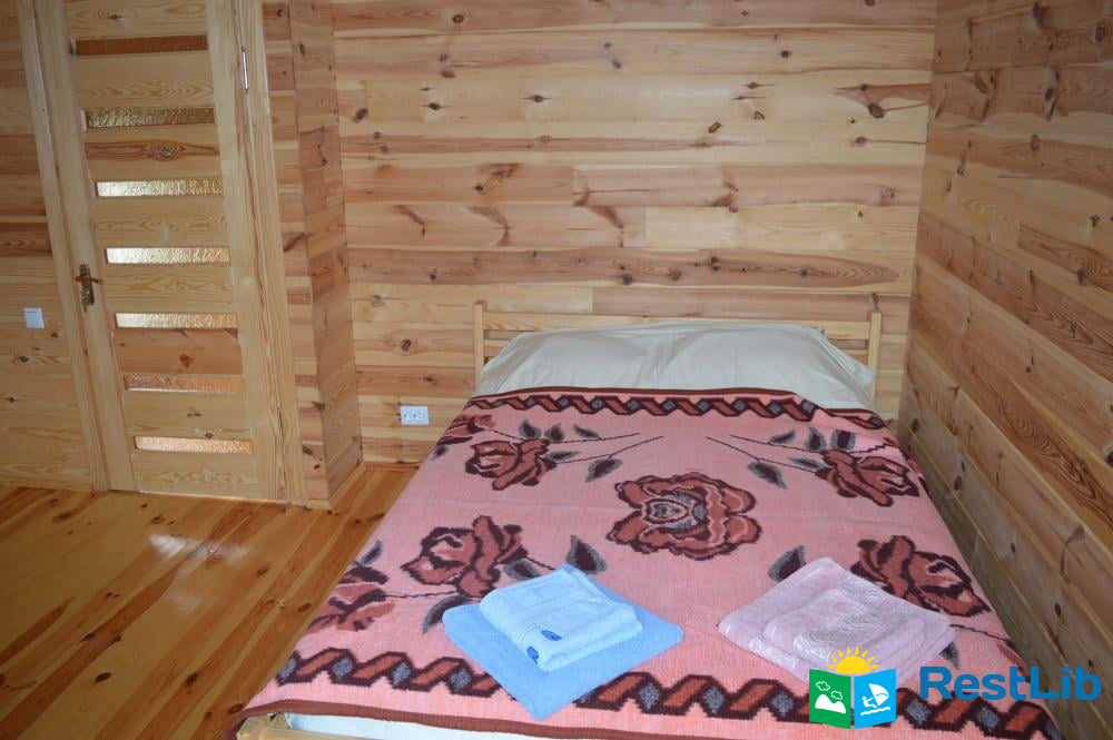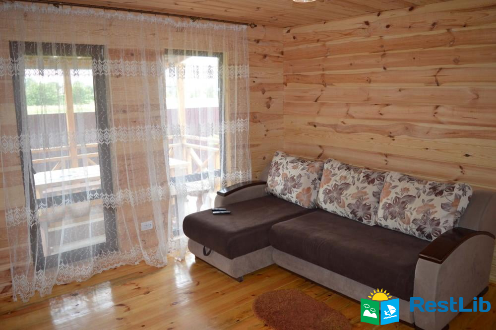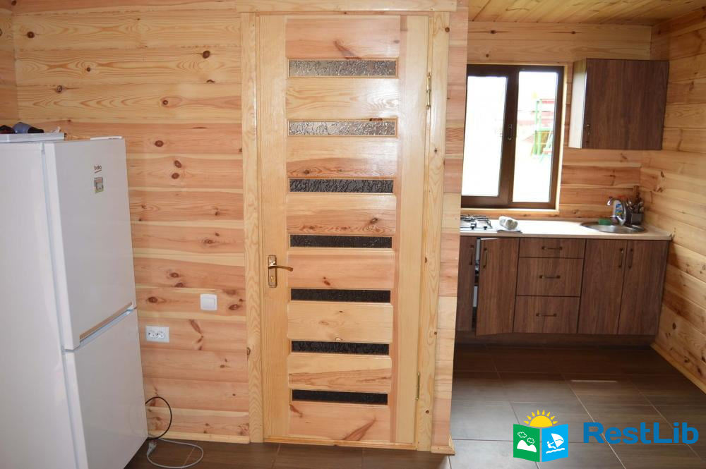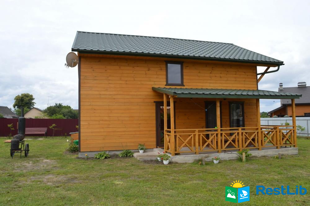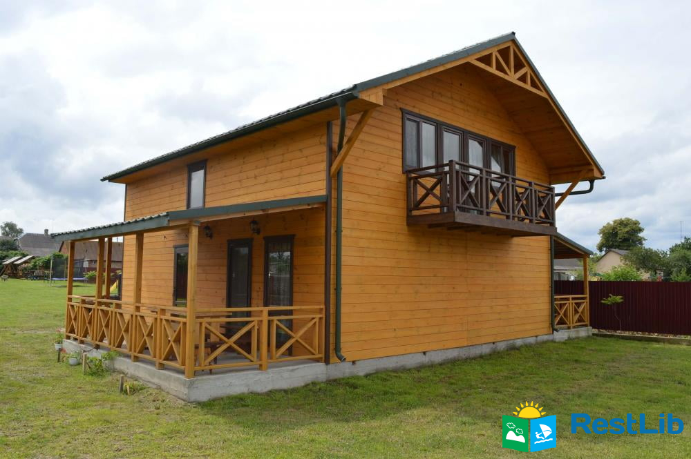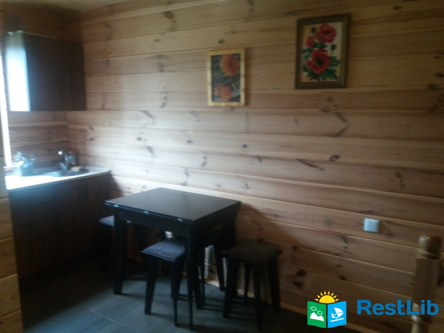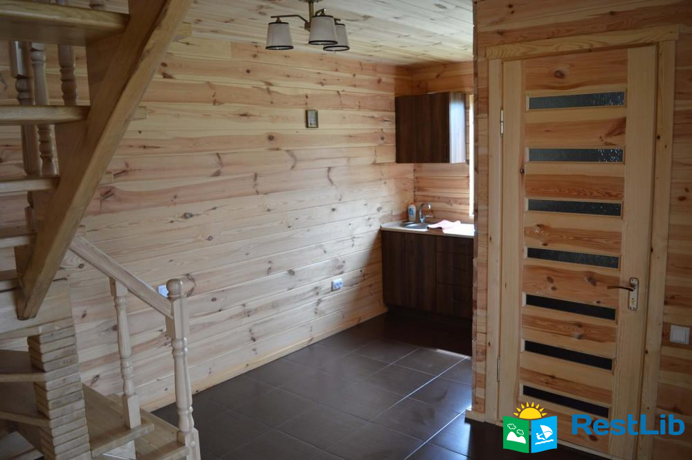 Половина будинку 8 чоловік. Половина двоповерхова, на першому поверсі: вітальня, кухня-студія, душ, туалет, умивальник. Другий поверх: дві спальні кімнати з двоспальними ліжками, один номер має вихід на балкон. Перед будинком крита тераса з столом.