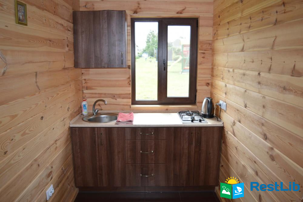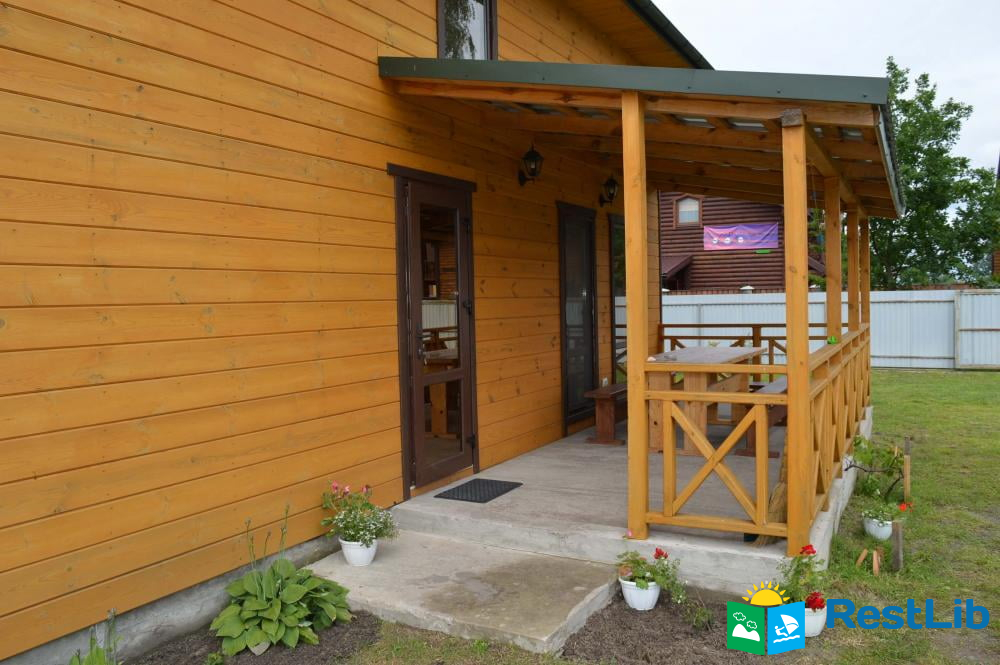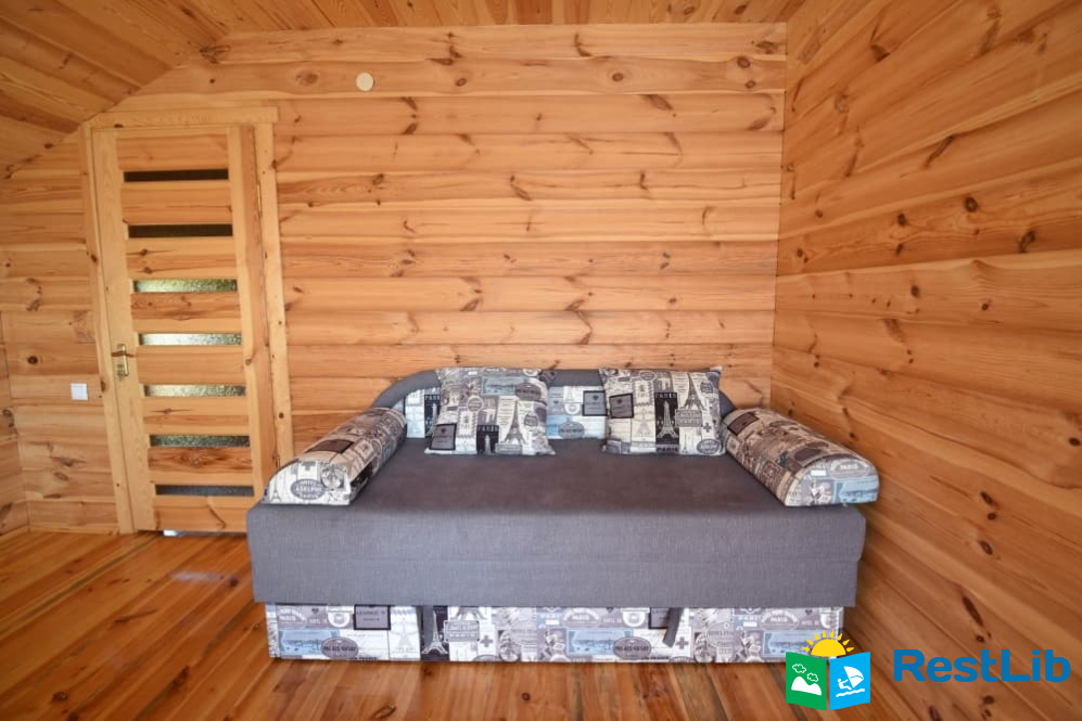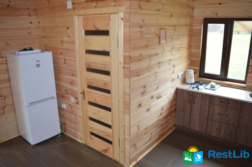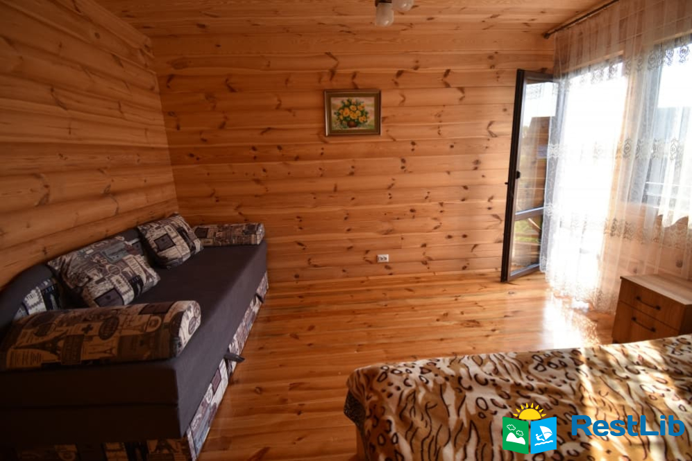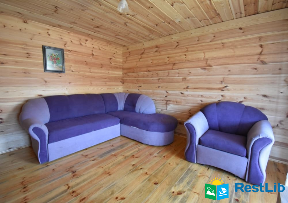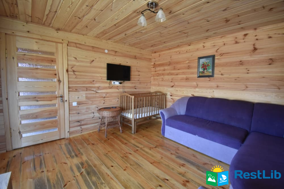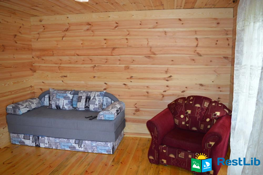 Половина будинку 8 чоловік. Половина двоповерхова, на першому поверсі: вітальня, кухня-студія, душ, туалет, умивальник. Другий поверх: дві спальні кімнати з двоспальними ліжками, один номер має вихід на балкон. Перед будинком крита тераса з столом.