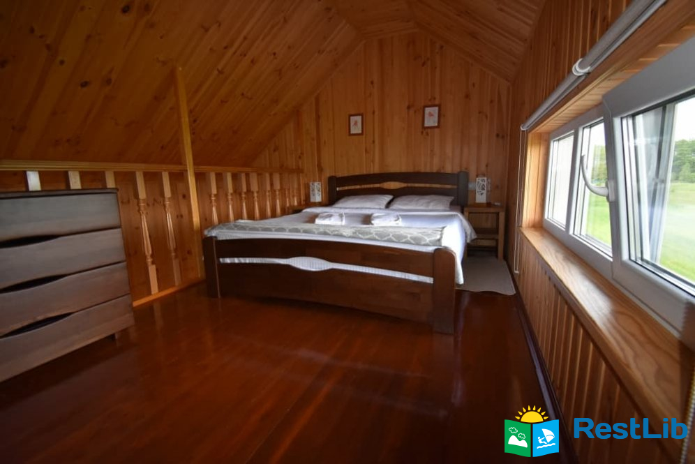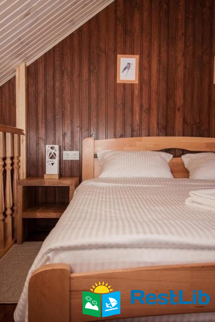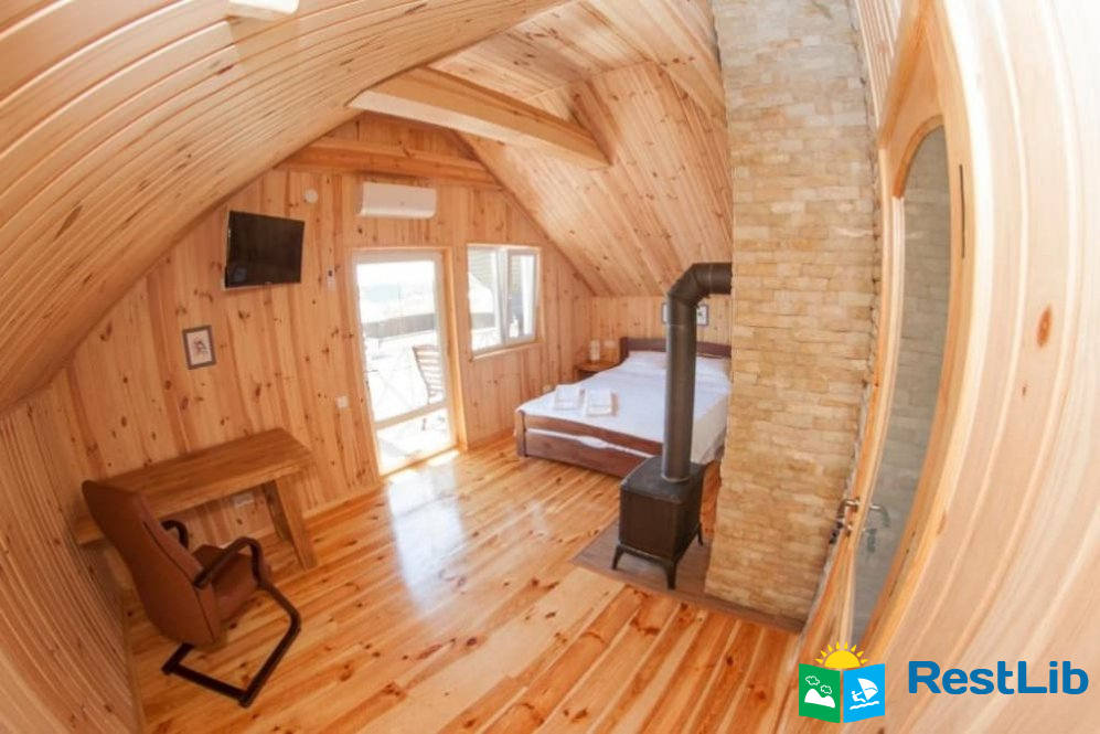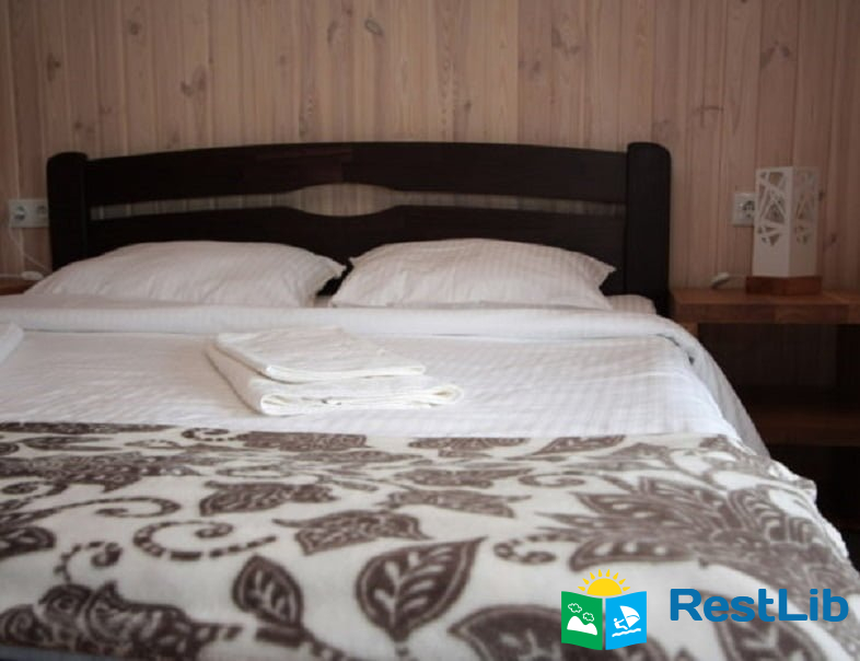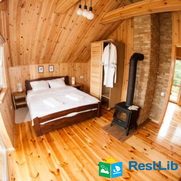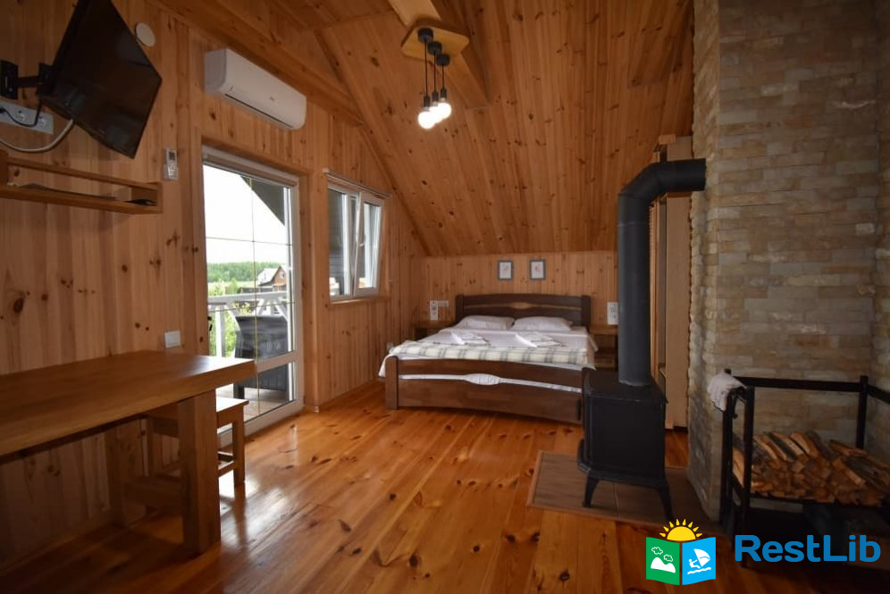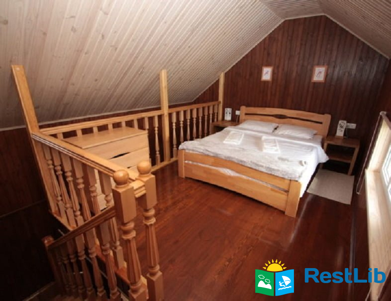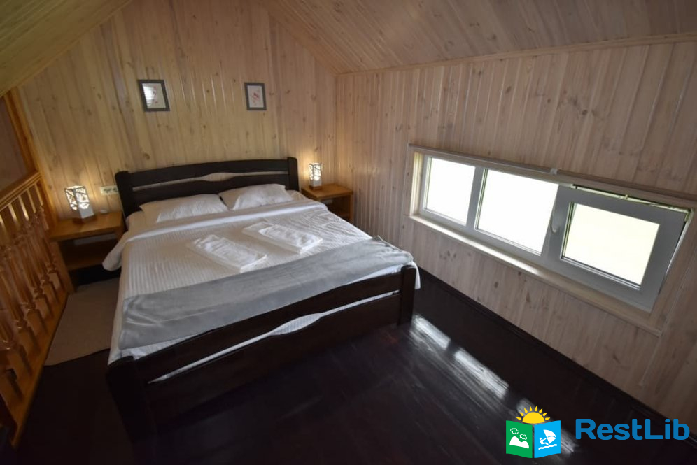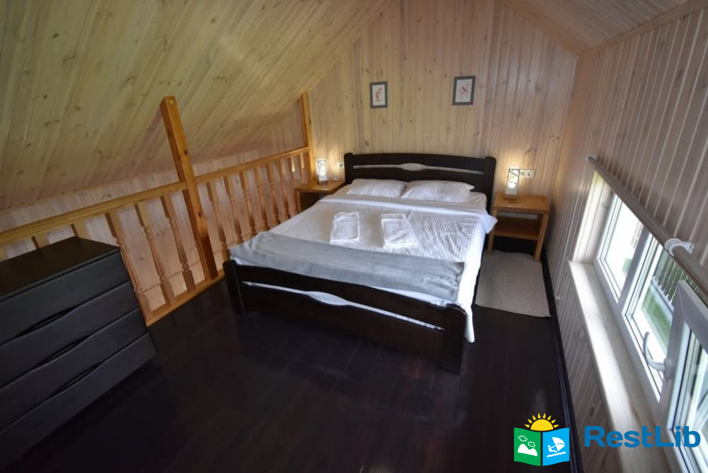 - Двоповерховий котедж, у якому розташований номер Люкс, знаходиться окремо від інших номерів. На першому поверсі цього будиночку на гостей чекає сучасна сауна з двома кімнатами відпочинку та роздягальнею, а на другому поверсі знаходиться сам номер. У ньому можуть комфортно розміститись двоє людей та за бажанням гостей є можливість встановлення ще одного додаткового спального місця.