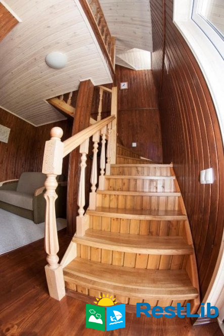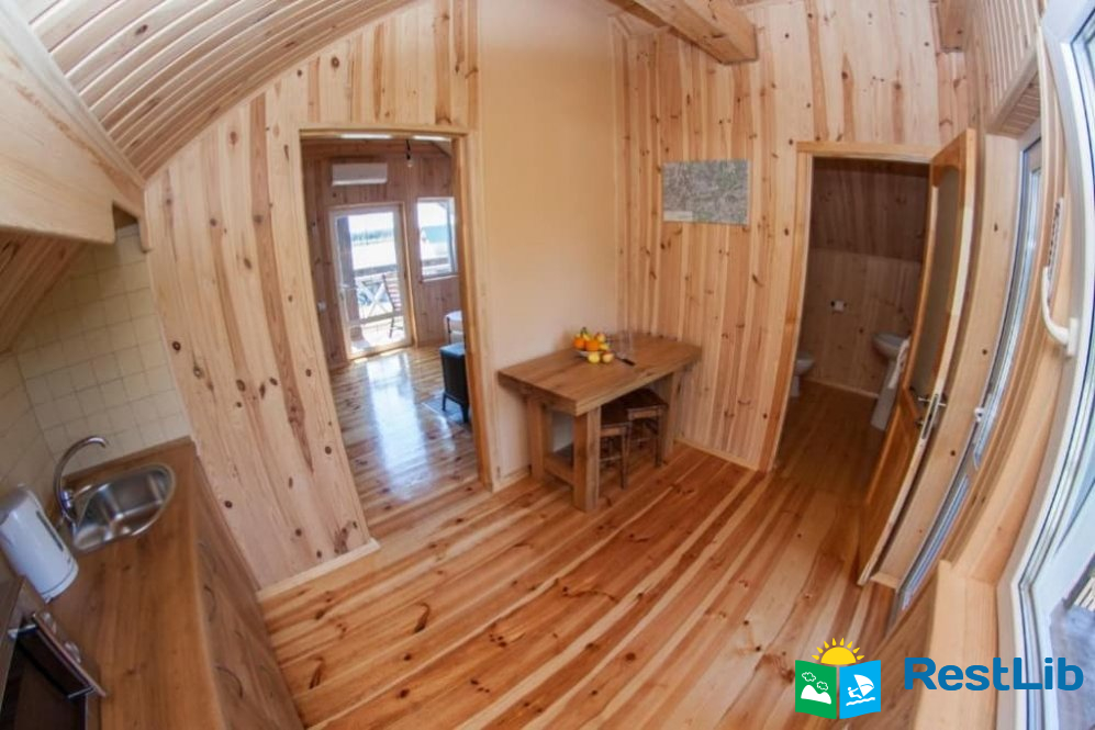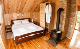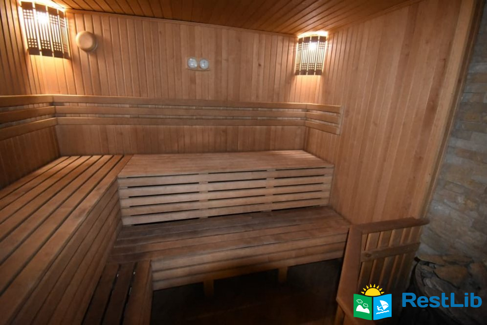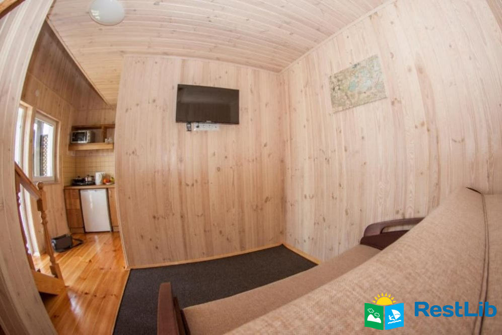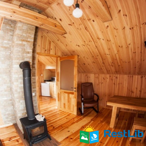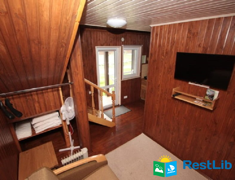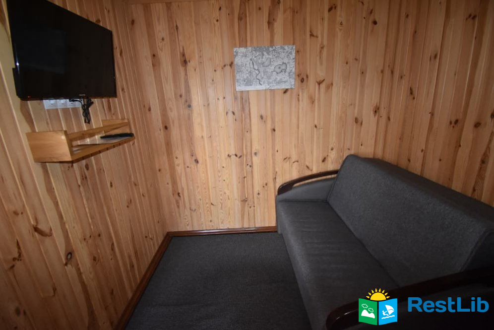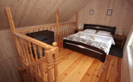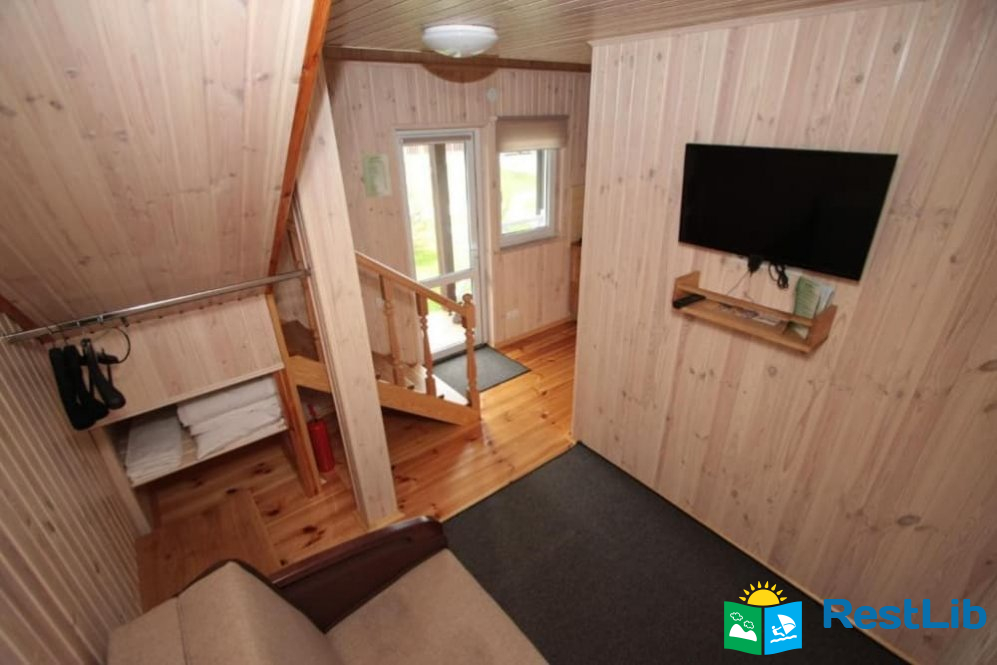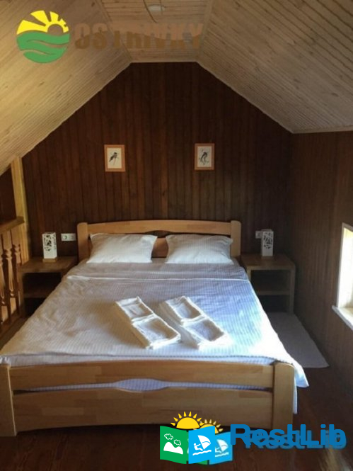 - Двоповерховий котедж, у якому розташований номер Люкс, знаходиться окремо від інших номерів. На першому поверсі цього будиночку на гостей чекає сучасна сауна з двома кімнатами відпочинку та роздягальнею, а на другому поверсі знаходиться сам номер. У ньому можуть комфортно розміститись двоє людей та за бажанням гостей є можливість встановлення ще одного додаткового спального місця.