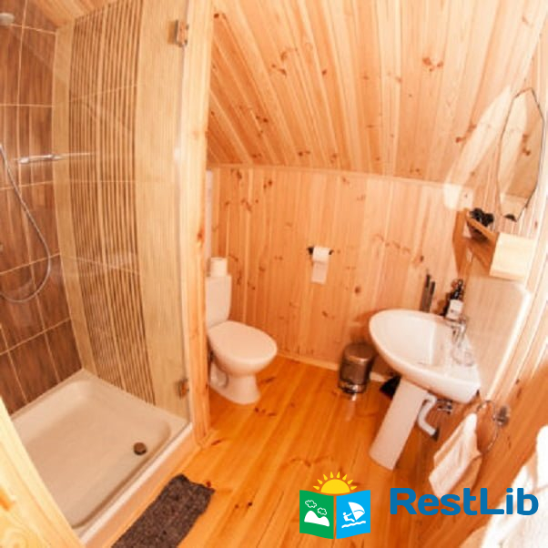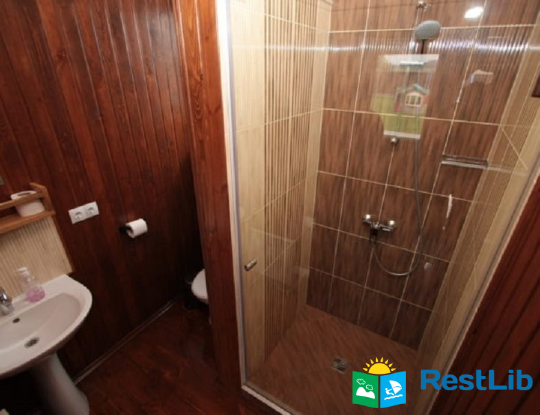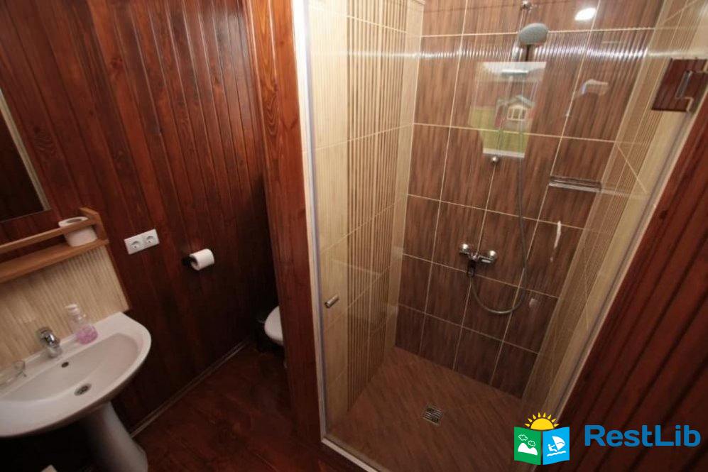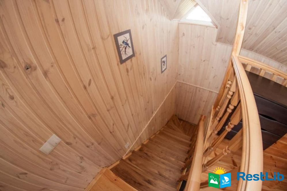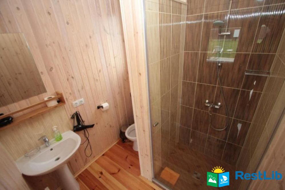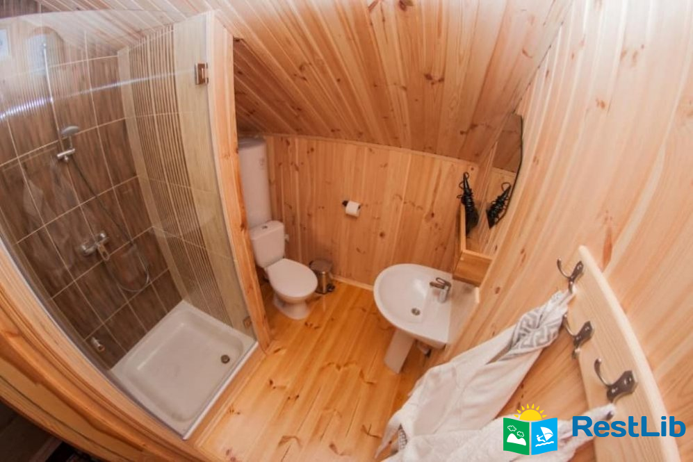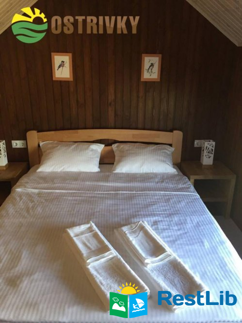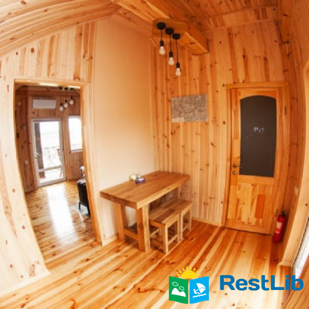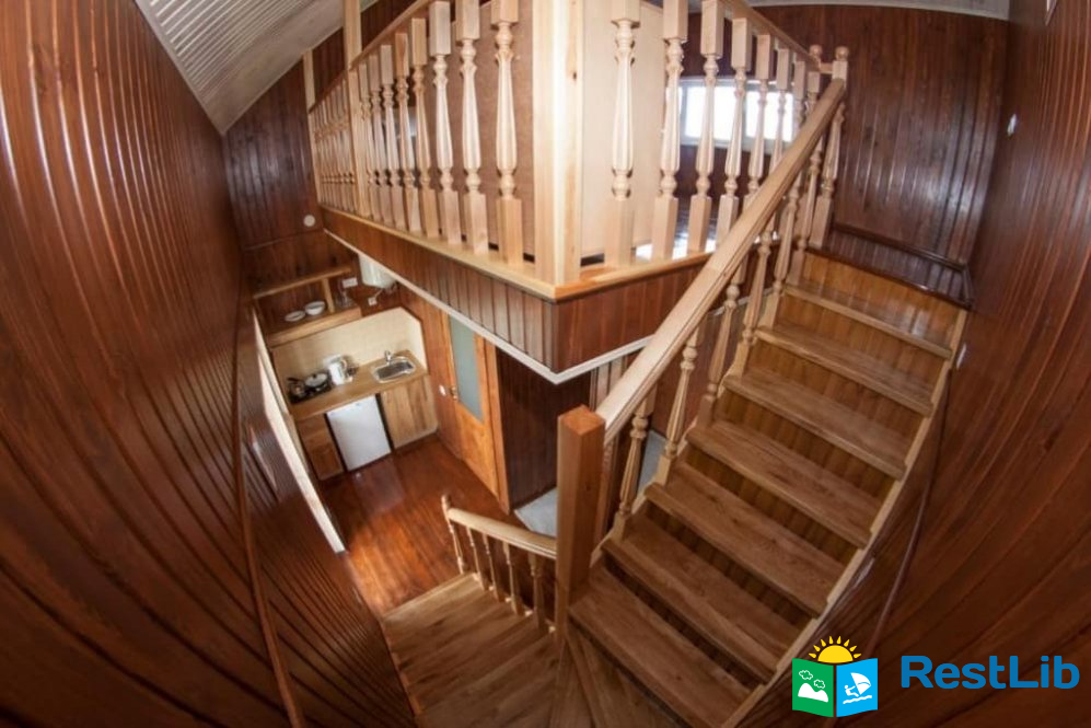- Двоповерховий котедж, у якому розташований номер Люкс, знаходиться окремо від інших номерів. На першому поверсі цього будиночку на гостей чекає сучасна сауна з двома кімнатами відпочинку та роздягальнею, а на другому поверсі знаходиться сам номер. У ньому можуть комфортно розміститись двоє людей та за бажанням гостей є можливість встановлення ще одного додаткового спального місця.