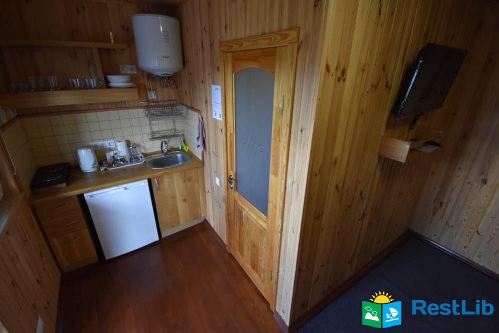 Тут на вас чекає не лише простора та дуже затишна спальня з великим ліжком і телевізором, ванна кімната з душем, але й кухня з усім необхідним приладдям та посудом. Ще одним приємним бонусом у номері Люкс став окремий вихід на терасу, де ви зможете відпочити та випити філіжанку запашної кави. Для тих, хто змушений працювати навіть на відпочинку, у номері Люкс є великий робочий стіл та м’яке крісло. В холодну пору ви зможете зігрітись біля каміна на дровах, котрий створить не лише комфортну температуру, але й романтичну атмосферу.