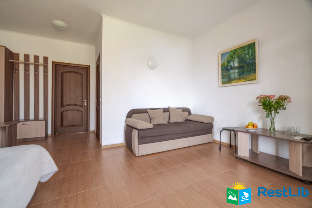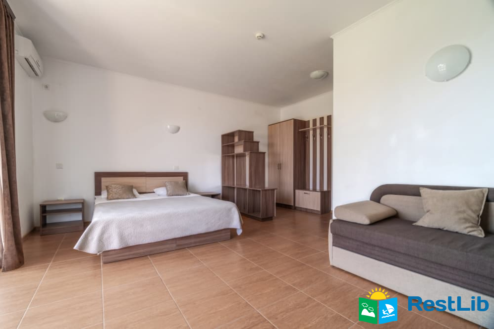 4х местный номер с одной двуспальной кроватью и раскладным диваном, в номере есть набор мебели, телевизор, холодильник, кондиционер, Wi-Fi, балкон.
