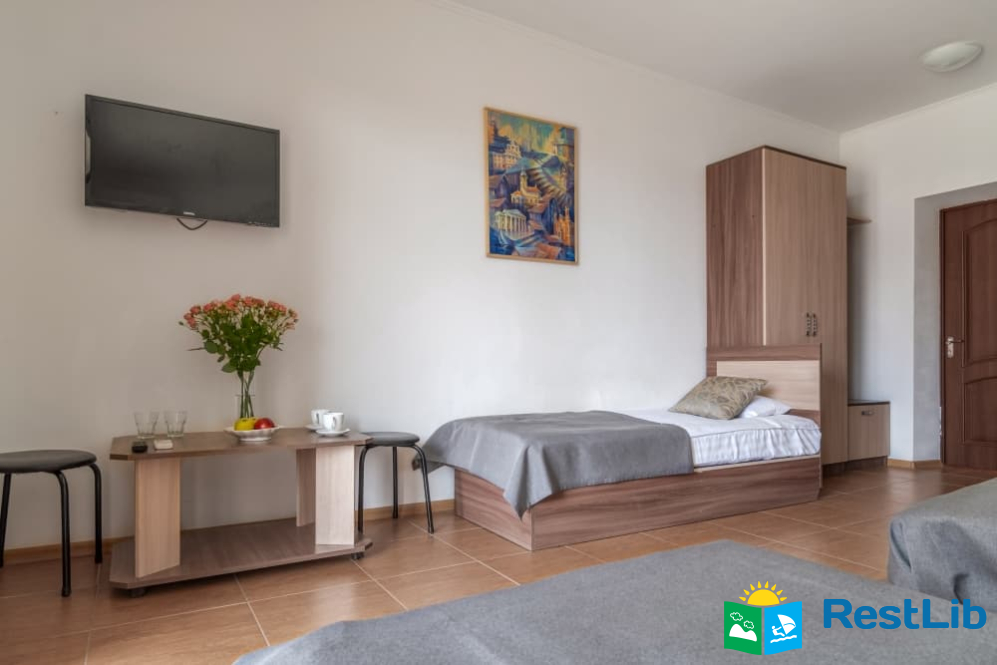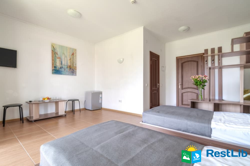 3х местный номер с одной двухспальной кроватью и одной односпальной, в номере есть набор мебели, телевизор, холодильник, кондиционер, Wi-Fi, балкон.