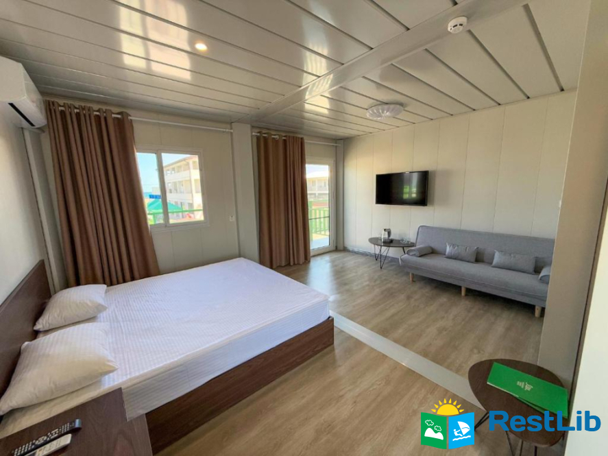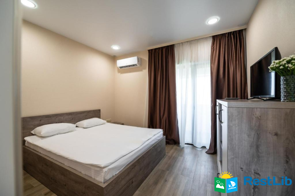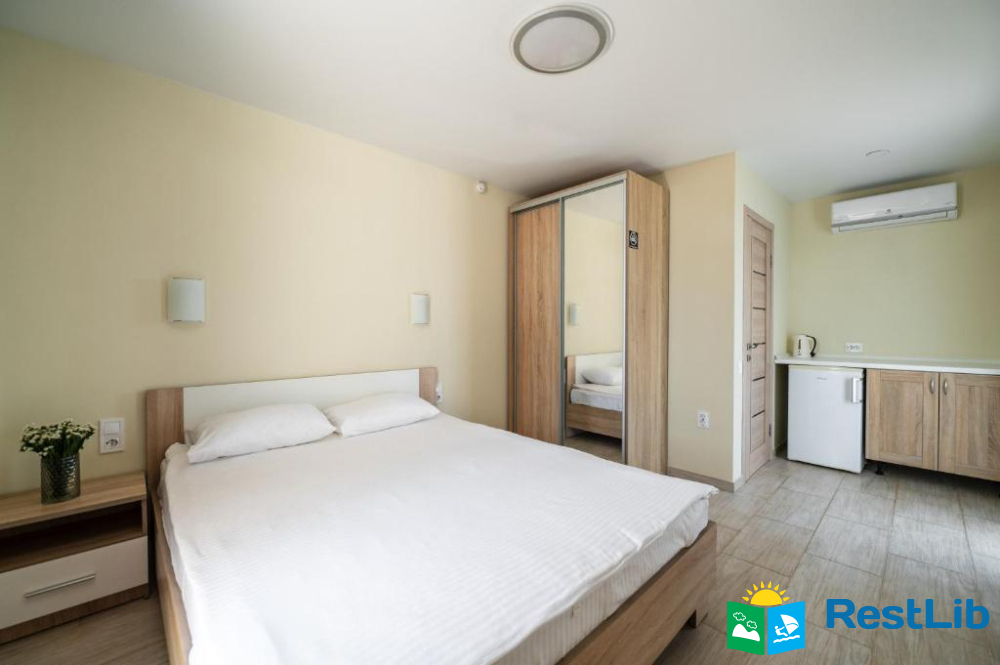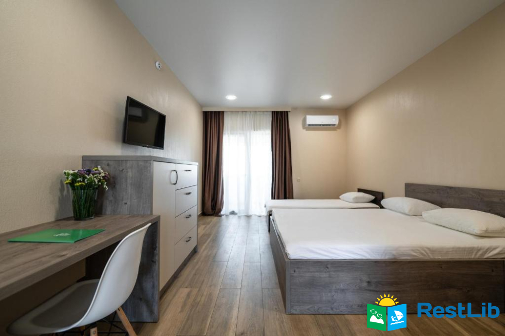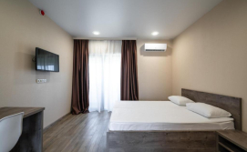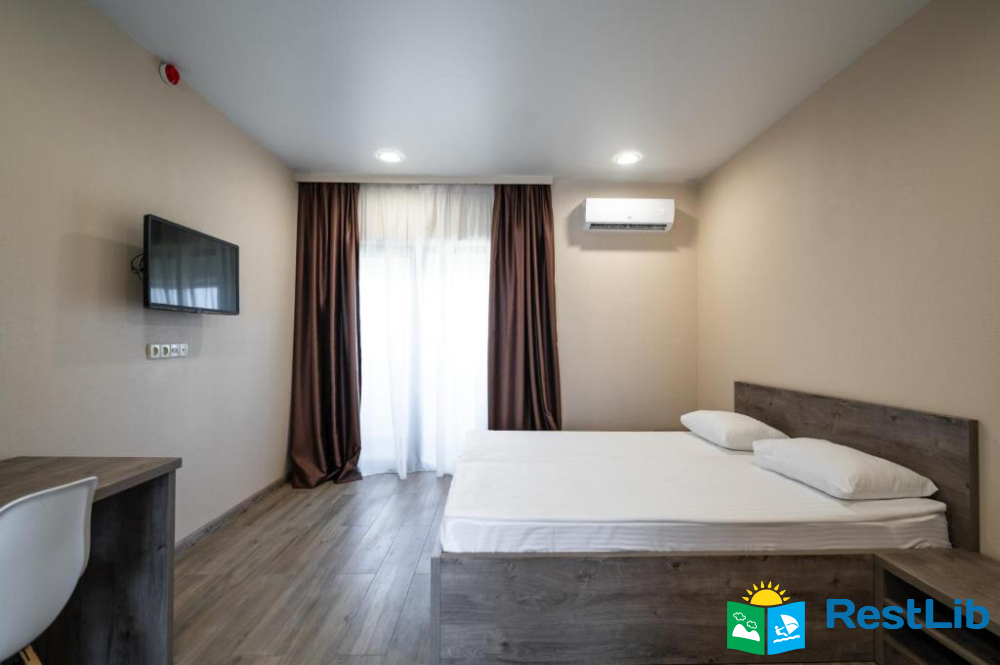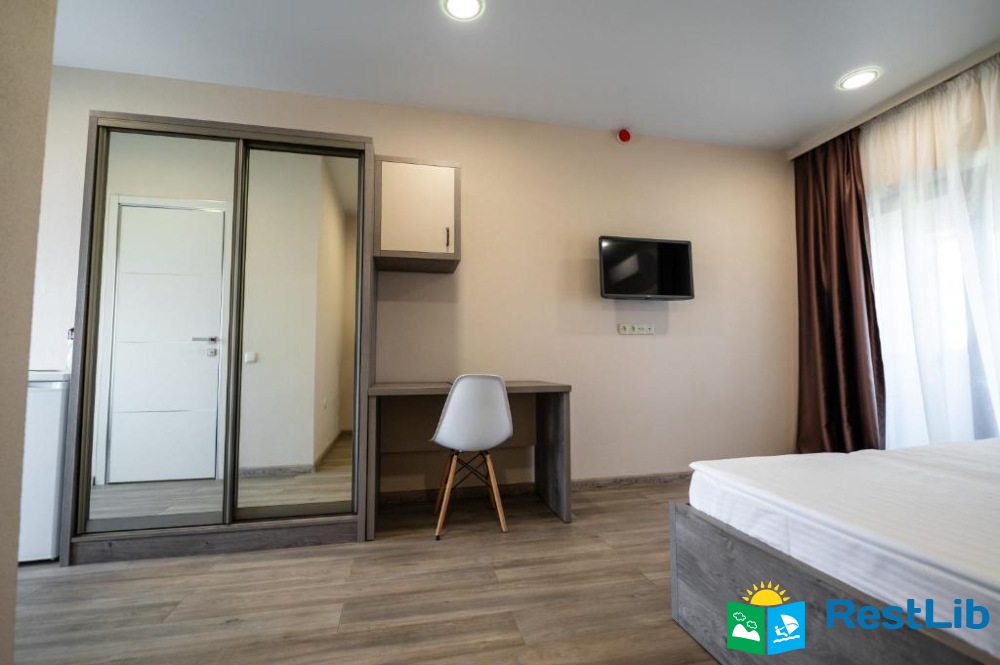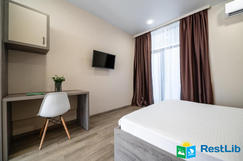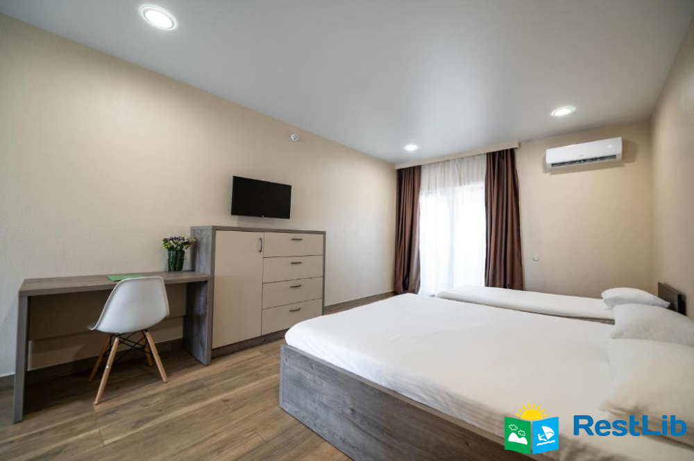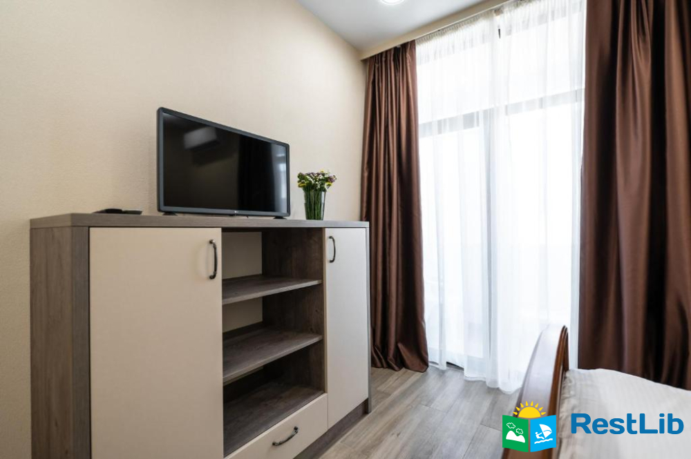 В номері: кондиціонер, холодильник, електричний чайник, посуд, сейф, душова кабіна, фен, рушники, телевізор, вай-фай.