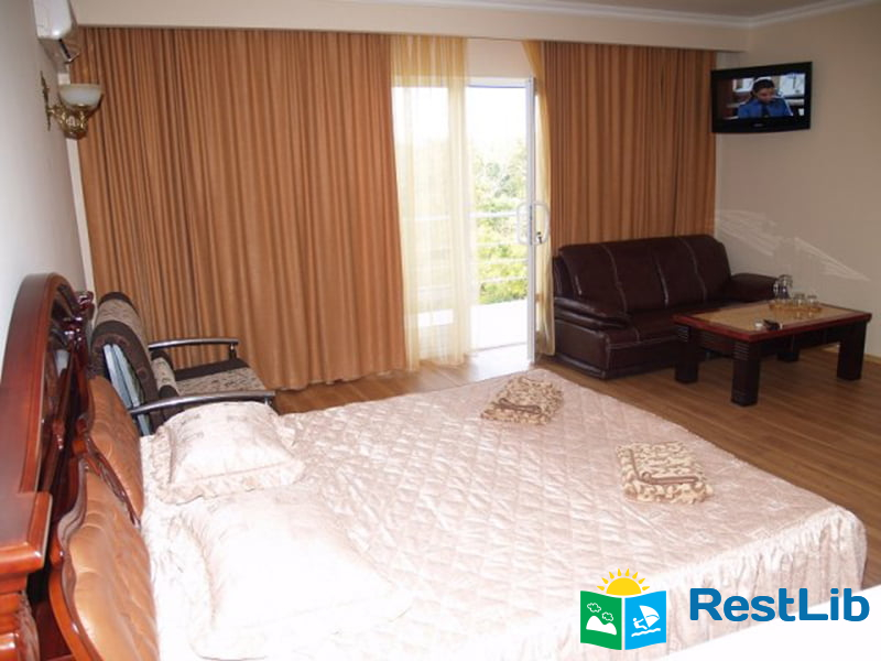 У номері є: велике двоспальне ліжко, шафа, журнальний столик з мармуру, шкіряний диван, санвузол, на балконах сушарки для одягу, стіл, стільці, кондиціонер, супутникове ТБ, телевізор, персональний міні-сейф, холодильник, фен, рушники, електрочайник (кава, чай).