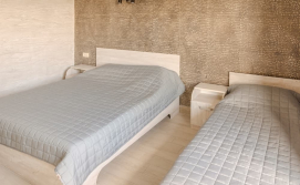 Номер 15,5 м2 с 1 двуспальной и 1 односпальной кроватью и собственной ванной комнатой с душем. Вместимость 2 взрослых или 2 взрослых и ребенок до 10 лет