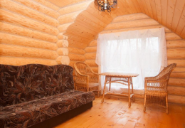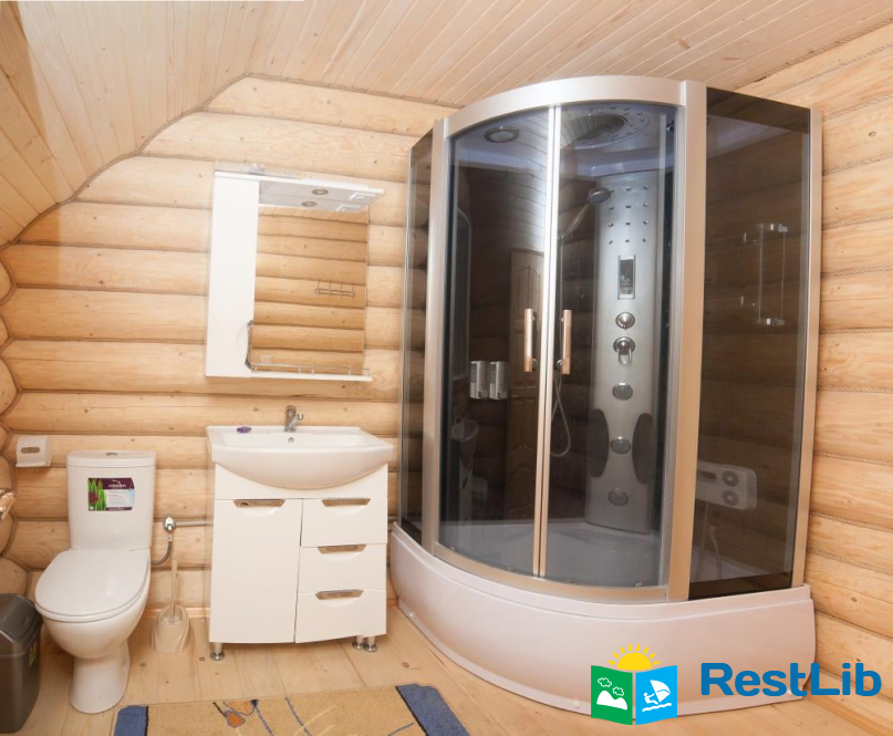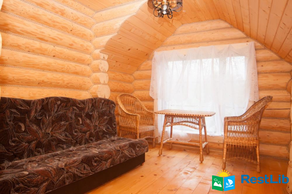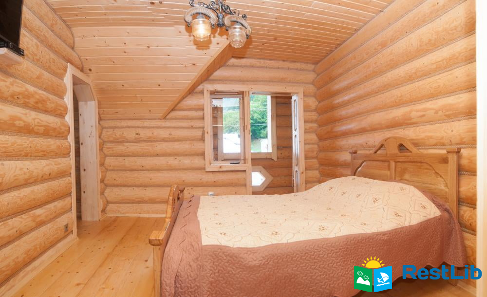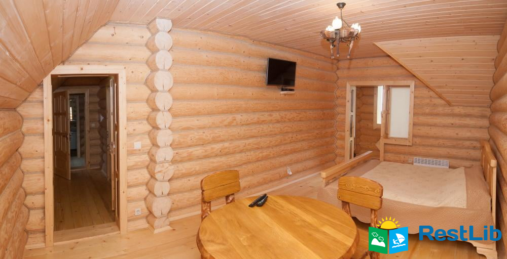 На другому - велика гостьова кімната оздоблена мисливськими трофеями з телевізором та розкладним диваном, кухня оснащена необхідним посудом та побутовою технікою (плита,холодильник, мікрохвильова піч, електро чайник, мультиварка). На поверсі є санвузол з душовою кабіною.