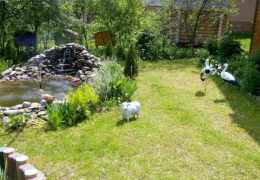На території: декоративний фонтан, гойдалка, багато вічнозелених рослин, парковка.