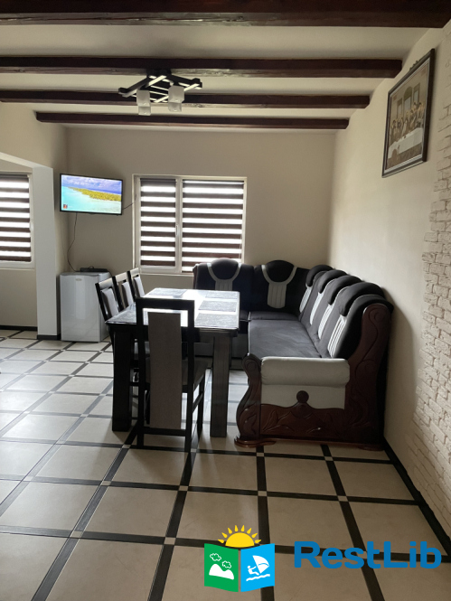 На першому поверсі - кухня (газова плита, мікрохвильова піч, холодильник, електрочайник,посуд, мийка); їдальня ( стіл із стільцями, кухонне вогнище, розкладний диван); санвузол ( туалет, умивальник).