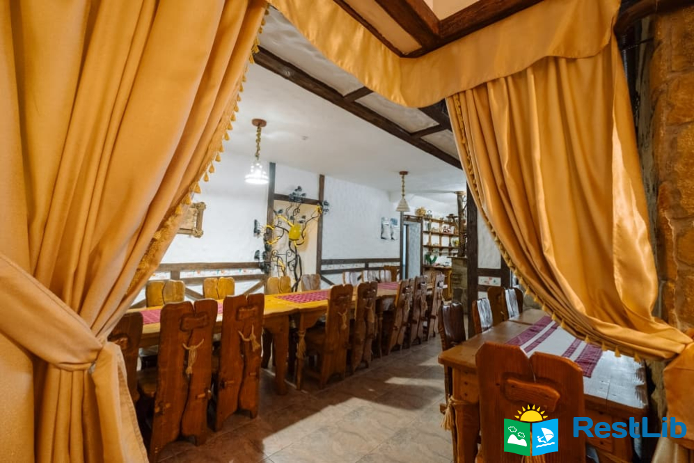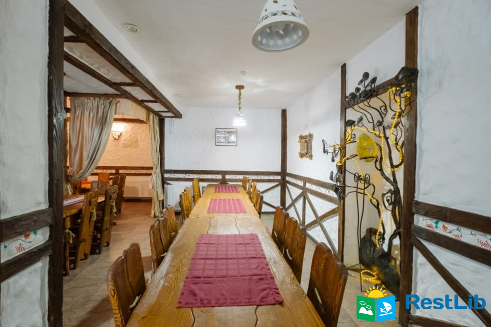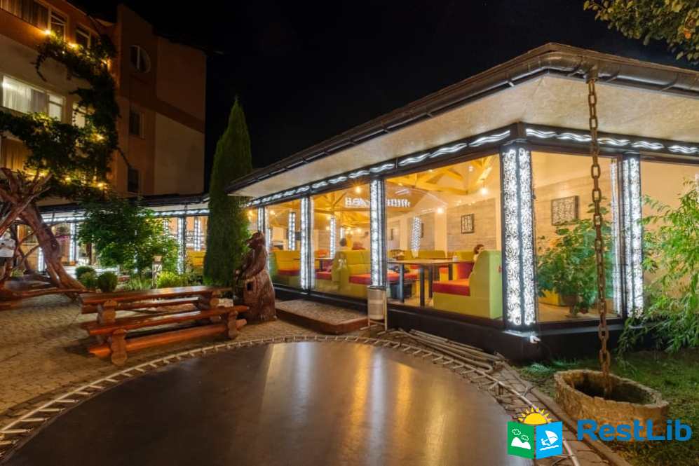 В ресторані за меню. Закарпатська, українська, європейська кухня. Ресторани обслуговують клієнтів з 8:30 до 23:00, замовлення приймаються до 22:00. Продовження роботи ресторану після 23:00 - 500 грн. за столик, за одну годину.