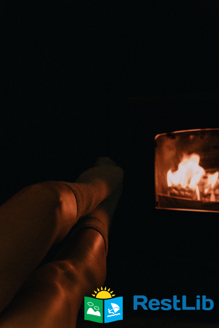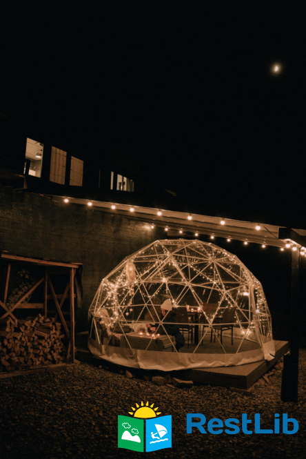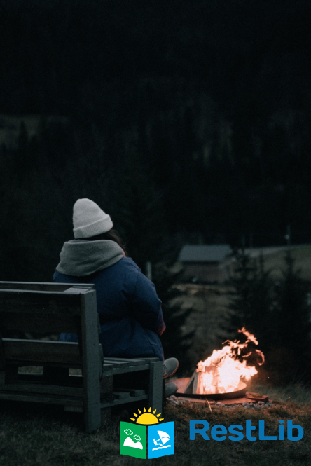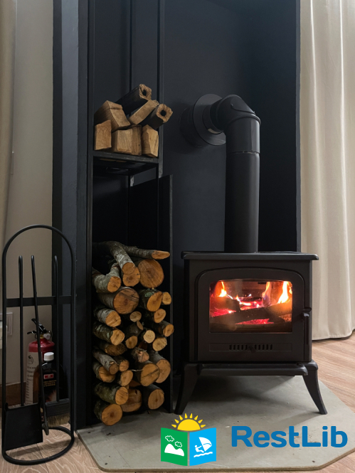 Камін, дрова. Мангал з шампурами. Стіл і стільці на терасі.
