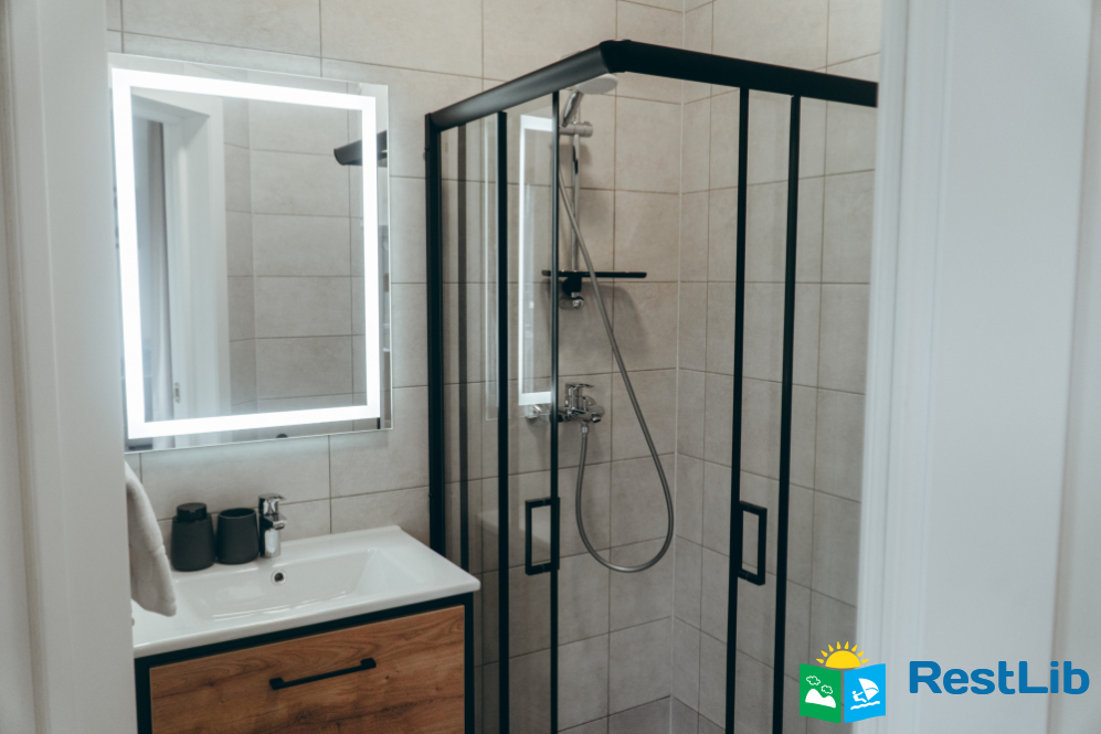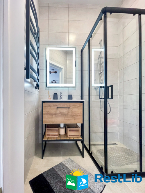 З техніки: Холодильник, 2 кондиціонери, мікрохвильова піч, електроплита, посудомийна машина, кавоварка, пилосос, проєктор, акумулятор, сферична тераса, сигналізація, безключовий доступ, камера на території.