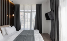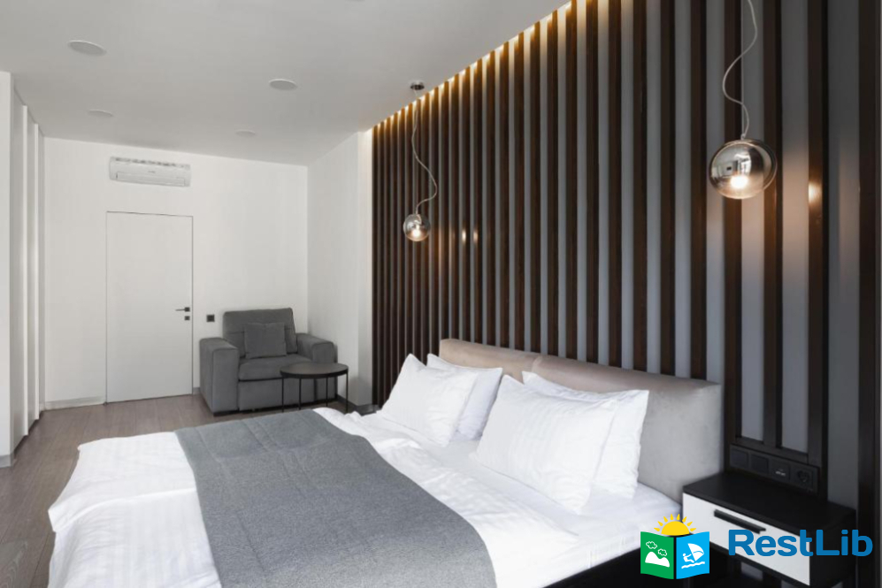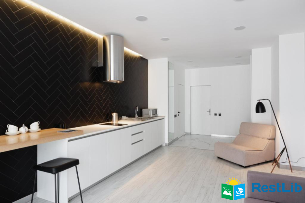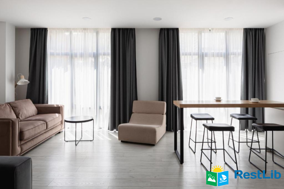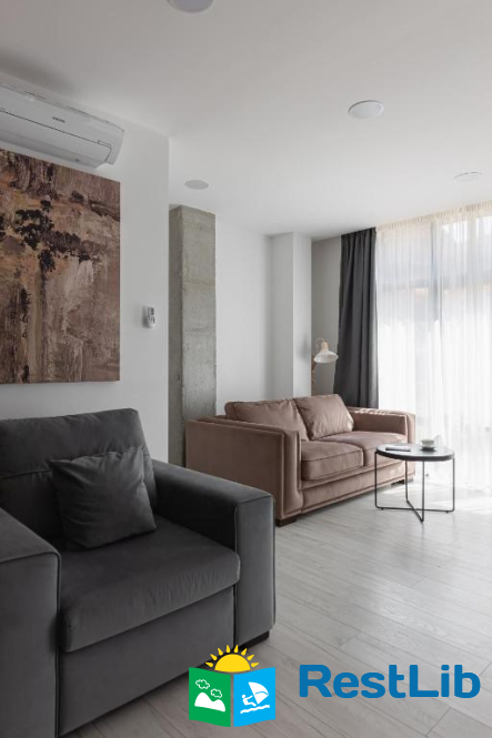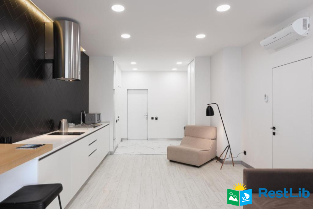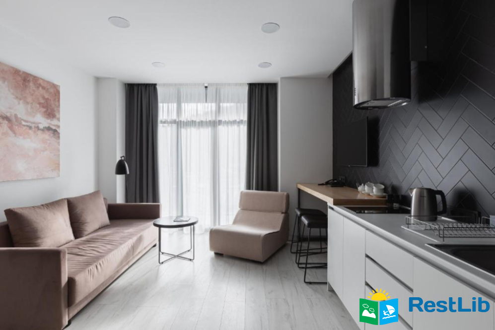 Авторський дизайн, сучасні та зручні меблі, просторі ванні кімнати з феном, повністю укомплектована кухня створюють особливу атмосферу для гостей апарт-готелю.
