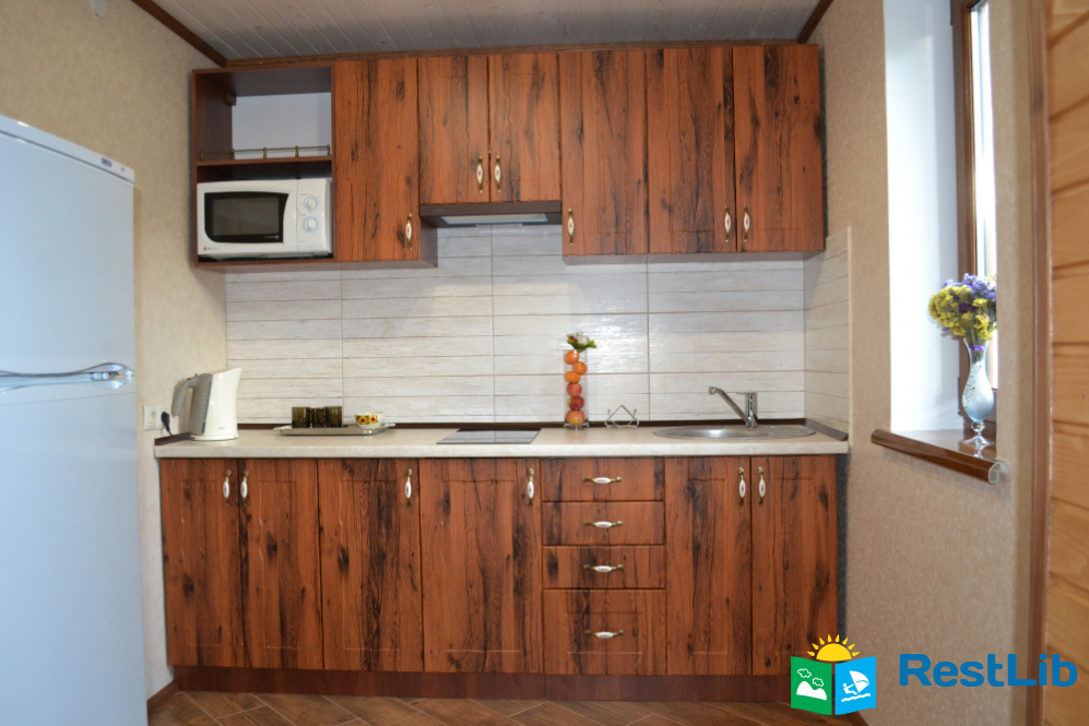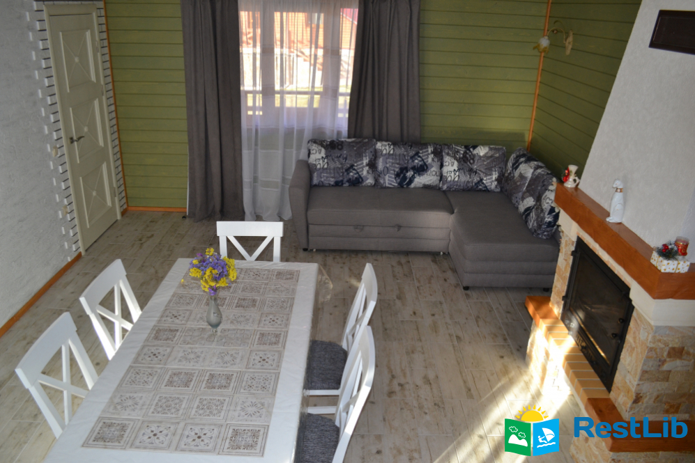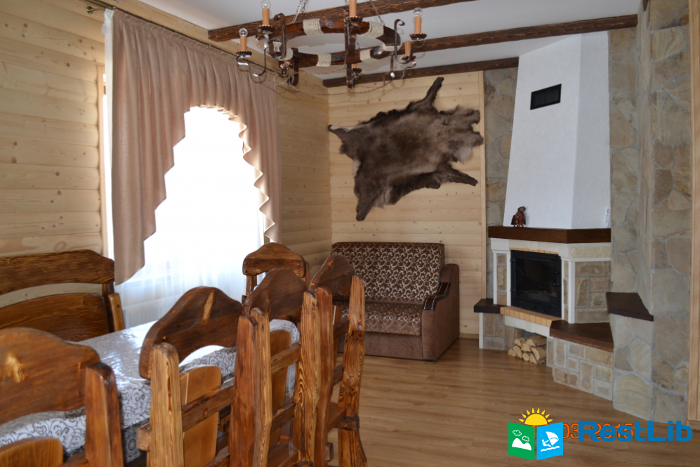 вітальня з каміном (розкладний диван, стіл, телевізор, камін), кухня (електрична плита, мікрохвильова піч, холодильник, електрочайник, посуд, мийка), санвузол (душова кабіна, туалет, умивальник)