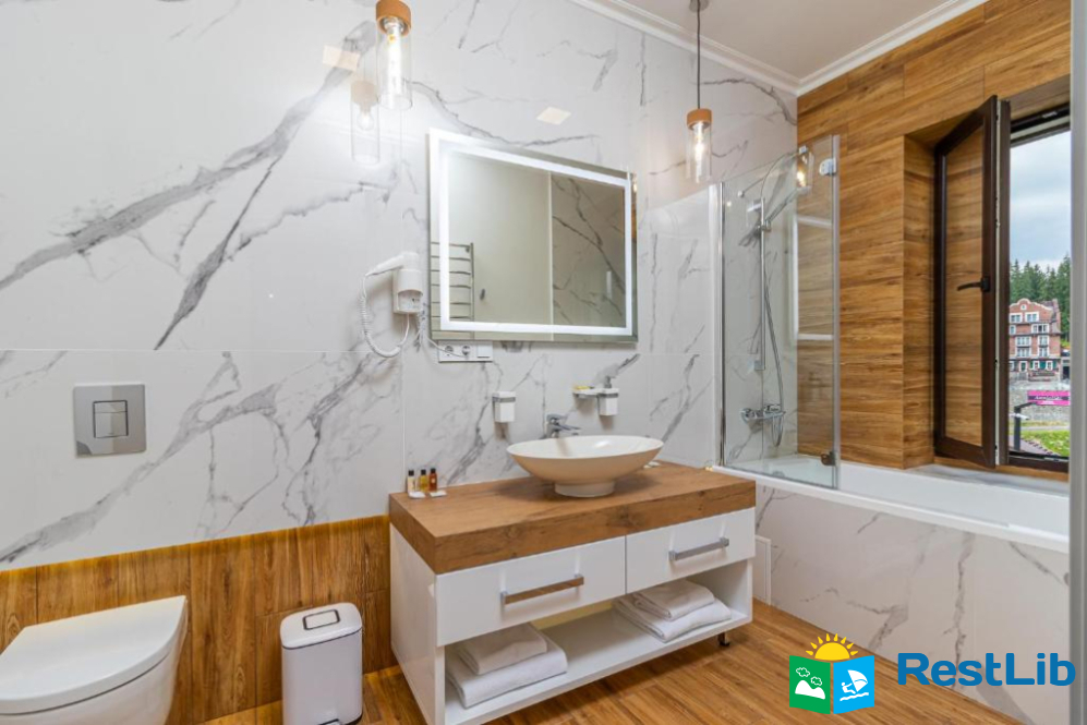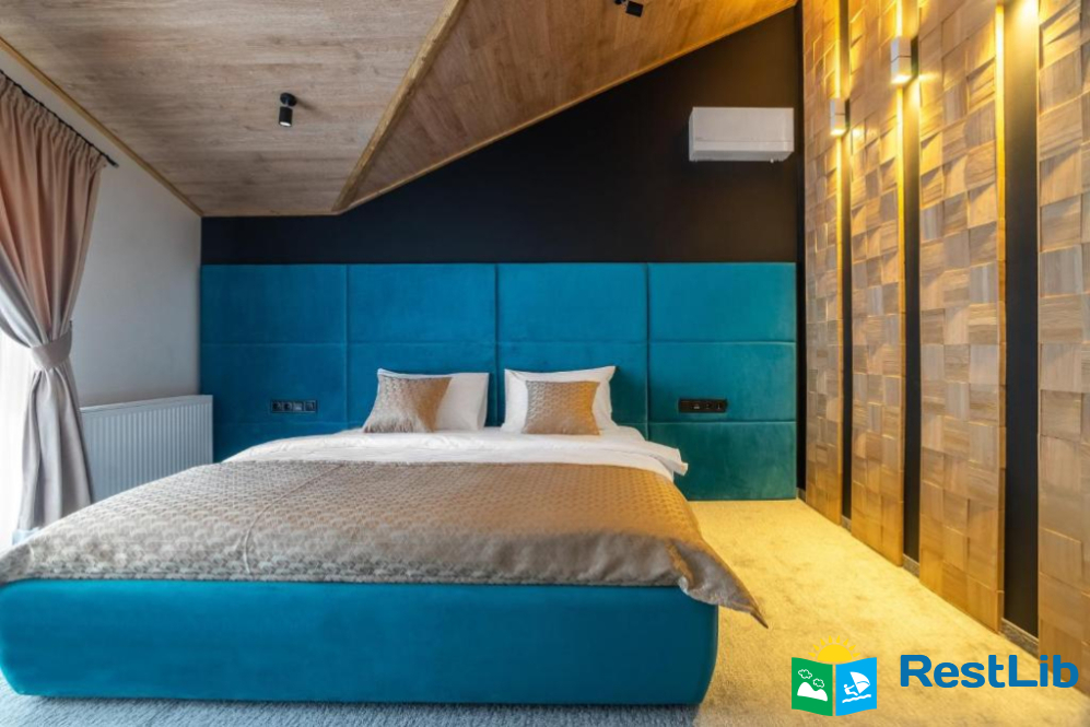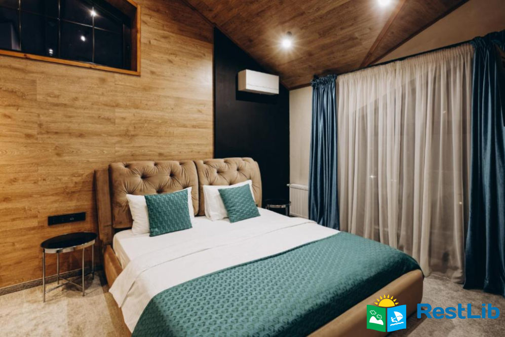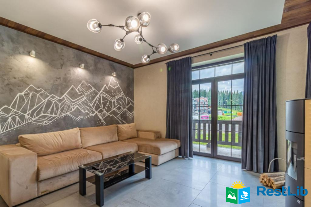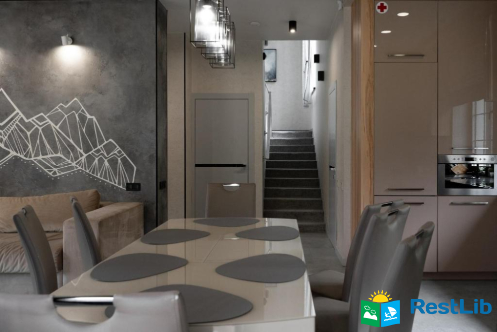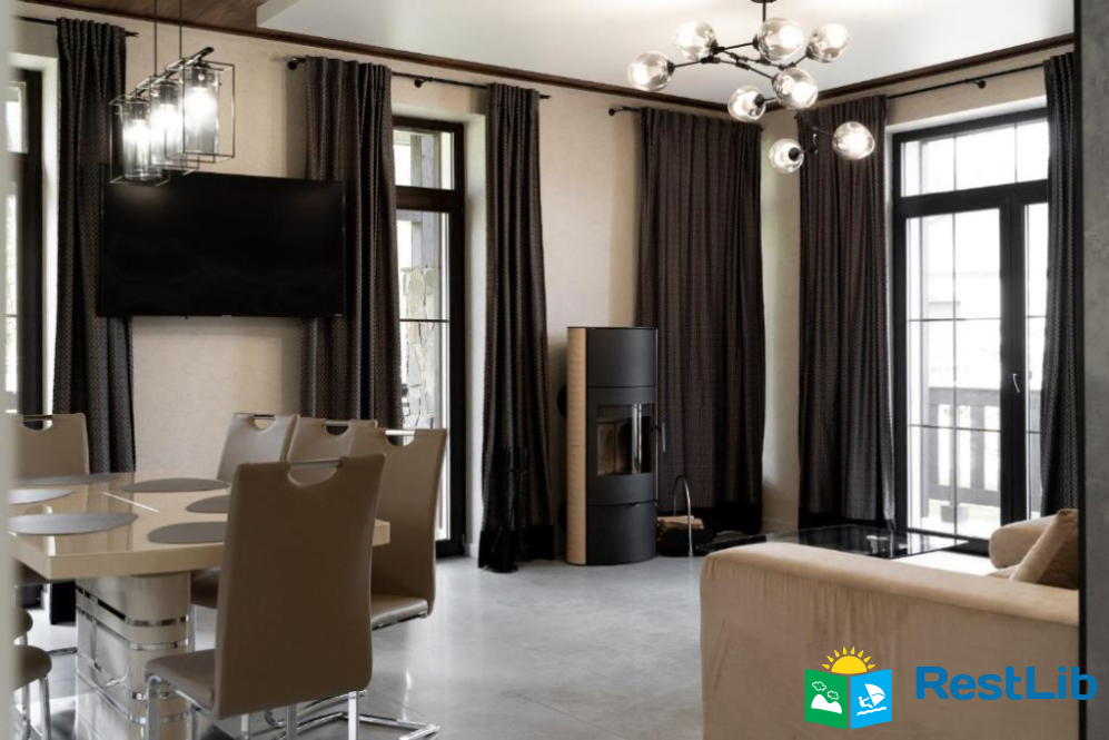 На першому поверсі розташована кухня-студія, обідня та лаундж зони з каміном. З кухні є вихід на терасу обладнану зоною барбекю та вуличними меблями. Кухня обладнана посудомийною машиною, електричною плитою, мікрохвильовою піччю, електрочайником, холодильником, тостером та кавоваркою. Три просторі спальні, з окремими ванними кімнатами, створені для комфортного відпочинку в Карпатах з родиною і друзями. Декор з дерева в інтер’єрі вдало поєднано з насиченими відтінками та сучасними елементами освітлення. В номерах є IP TV, безкоштовний Wi-Fi.