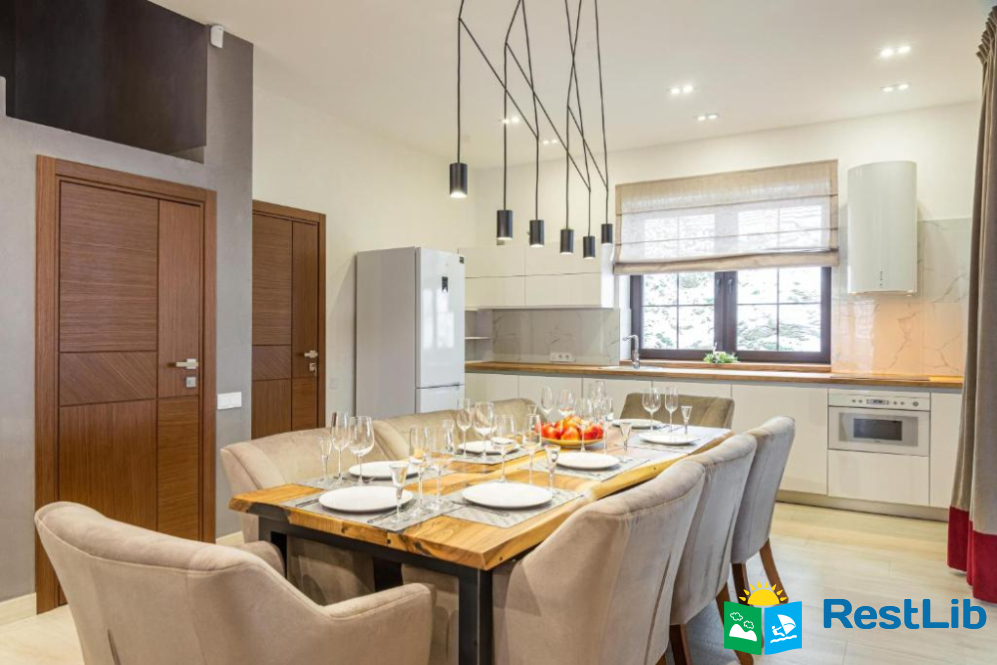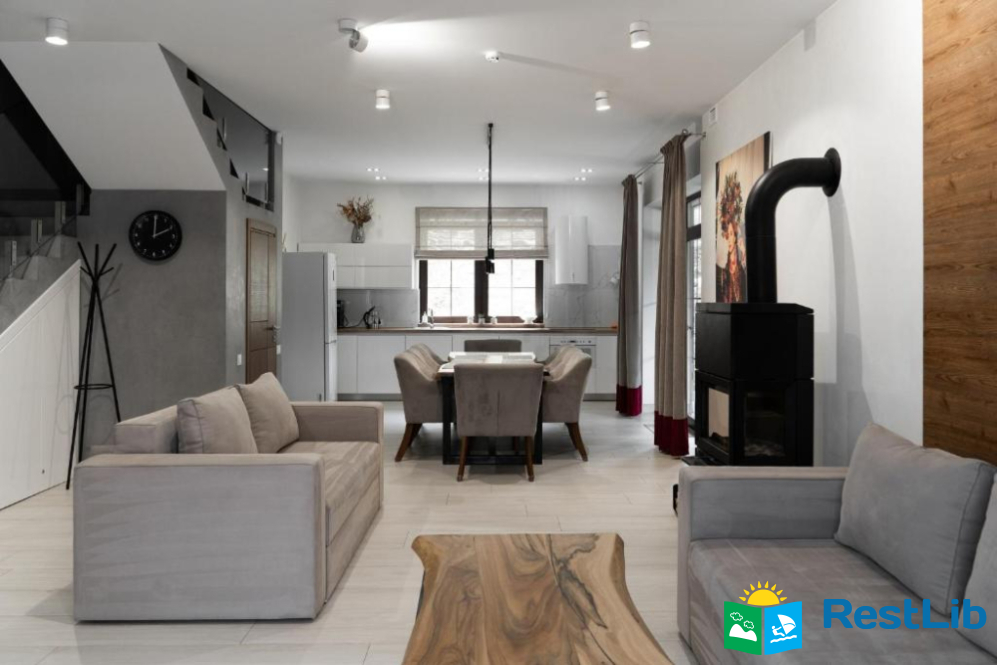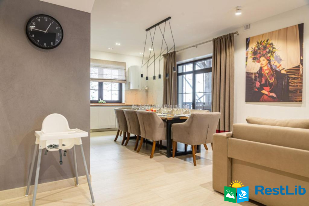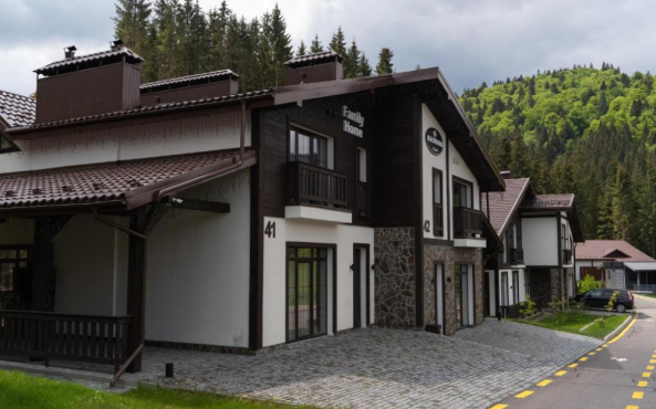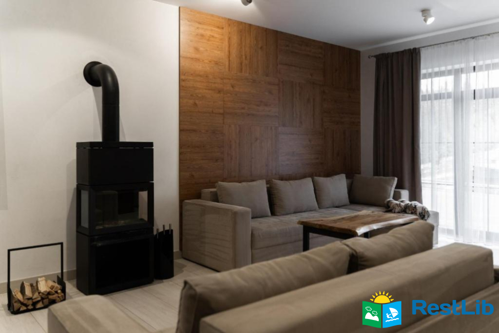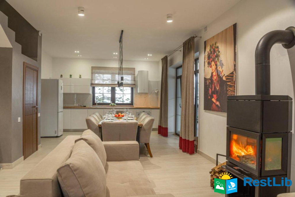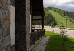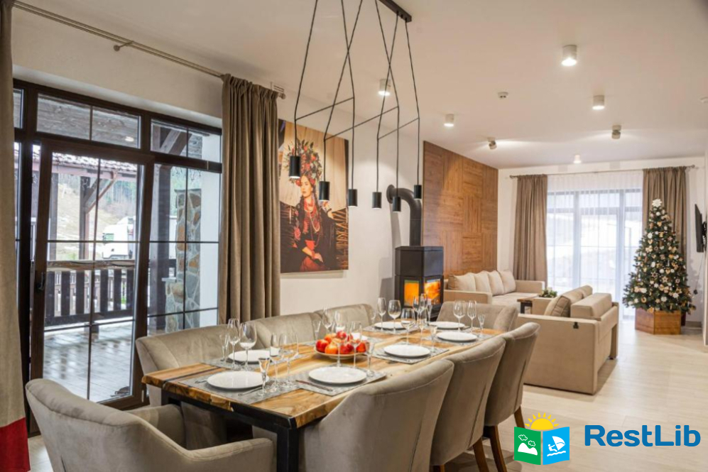 Сушка для лижного спорядження, приватна зона паркінгу, вихід на лижний схил створюють додатковий комфорт під час відпочинку. Декор з дерева поєднано з світлими відтінками інтер'єру та сучасними картинами. Шале уособлює затишок і спокій сучасної української оселі, де після насиченого дня комфортно провести час в колі сімї чи близької компанії.
