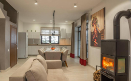 На першому поверсі розташована кухня-студія, обідня та лаундж зони з каміном. З кухні є вихід на терасу обладнану зоною барбекю.