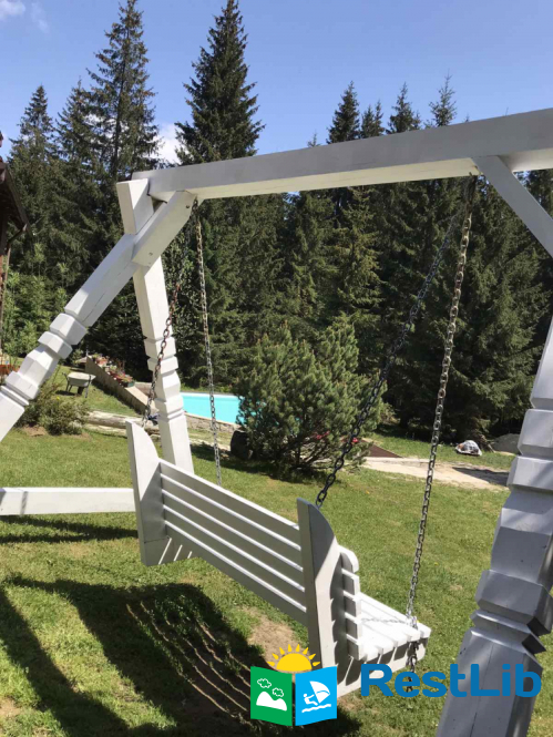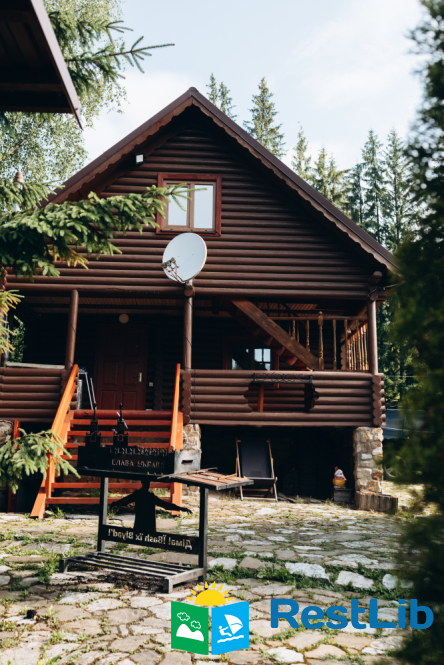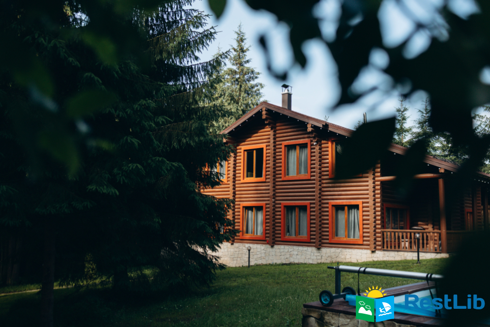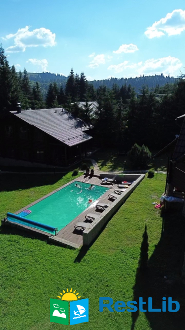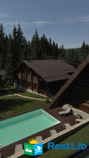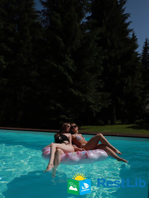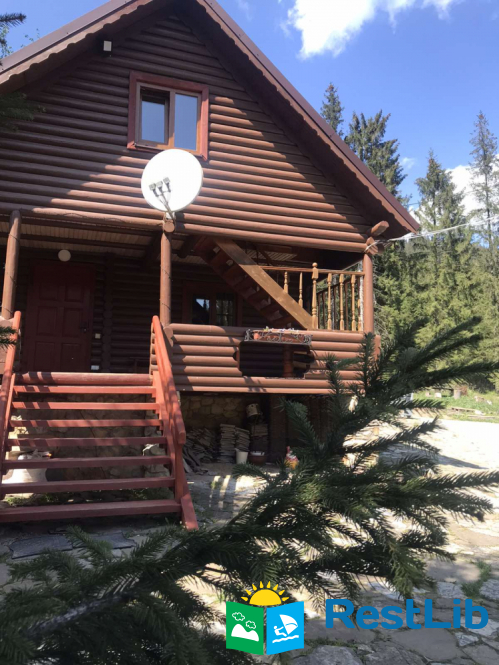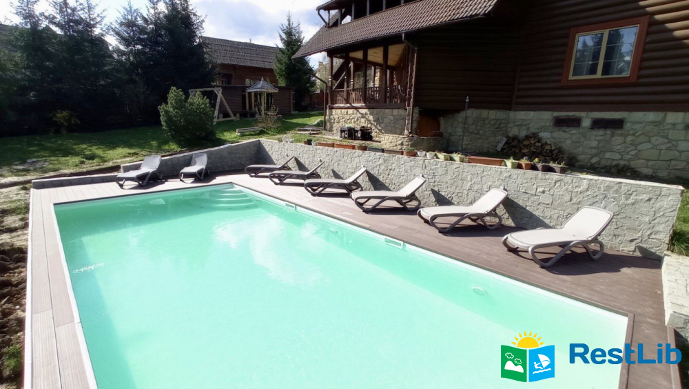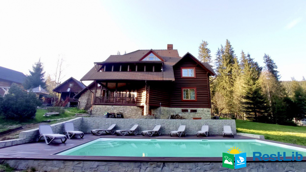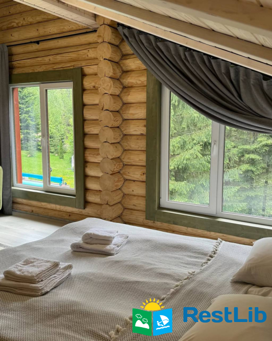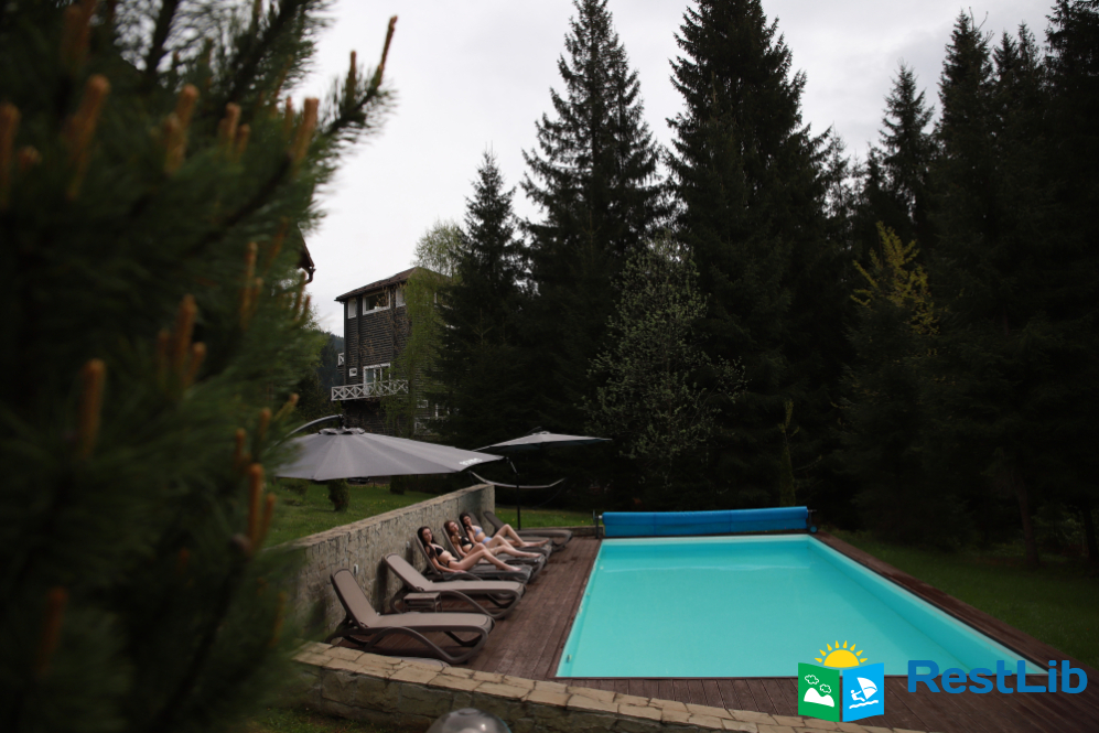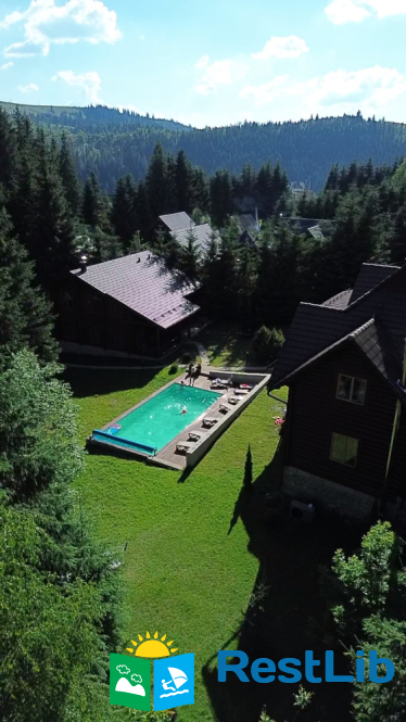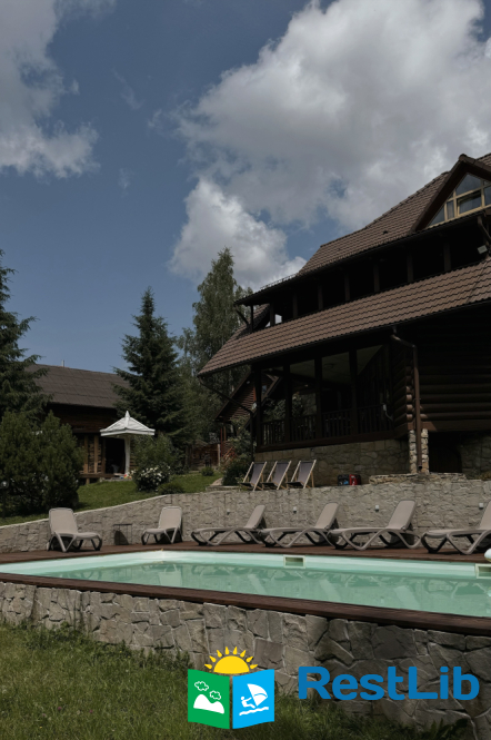 На великій зеленій території розміщені 4 котеджі з натурального зрубу на загальну кількість 42-50 людей, басейн з підігрівом, альтанка з мангалом, лазня із зоною відпочинку, дитячий ігровий майданчик, парковка (під відеоспостереженням).