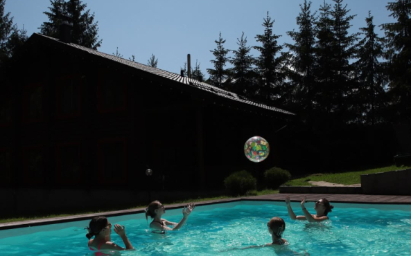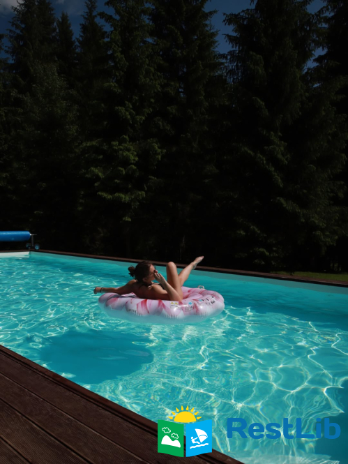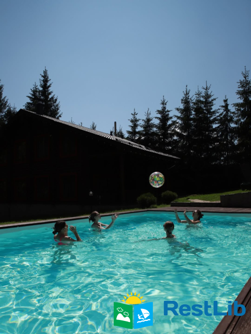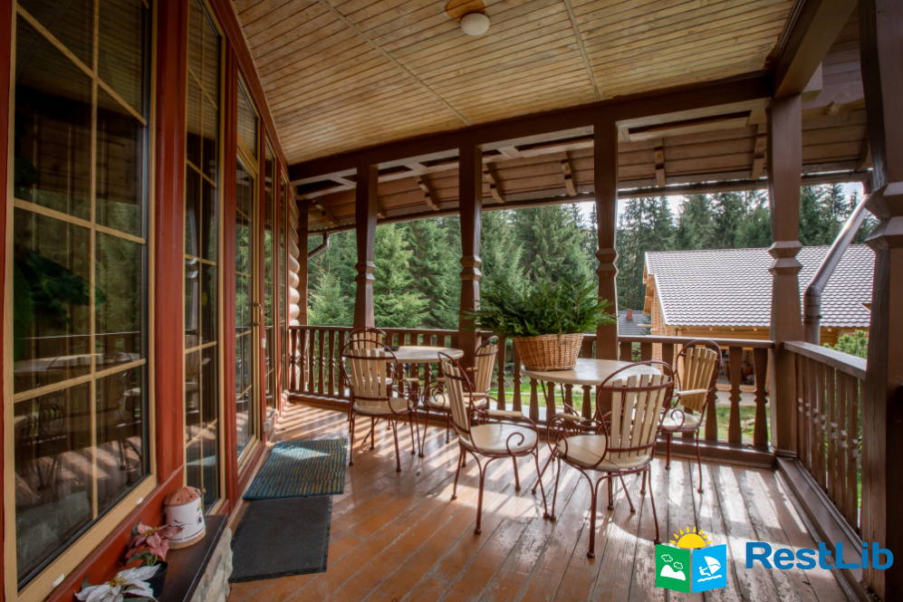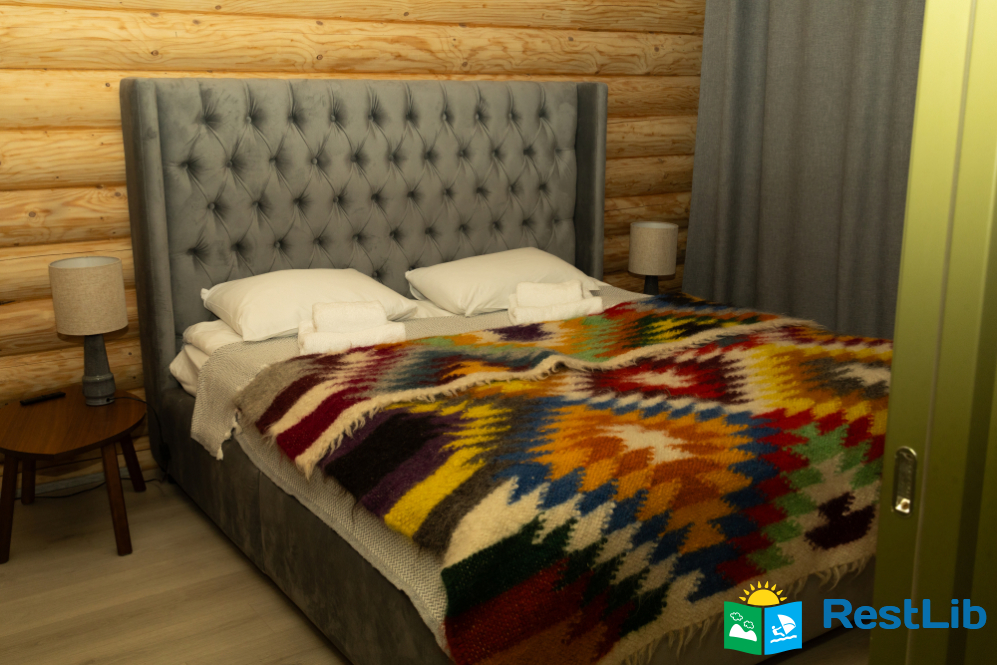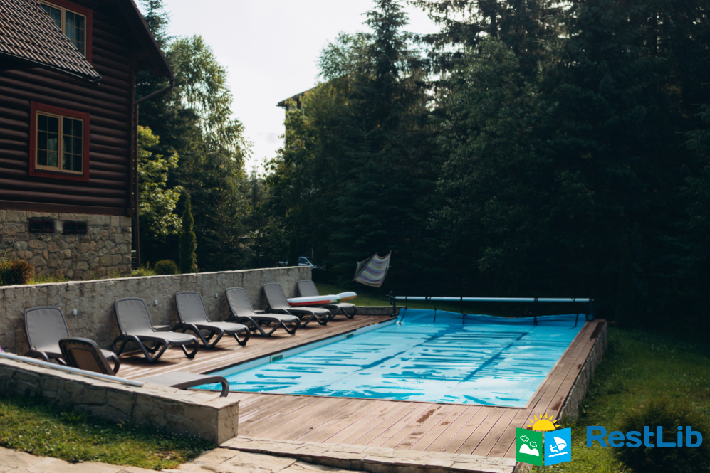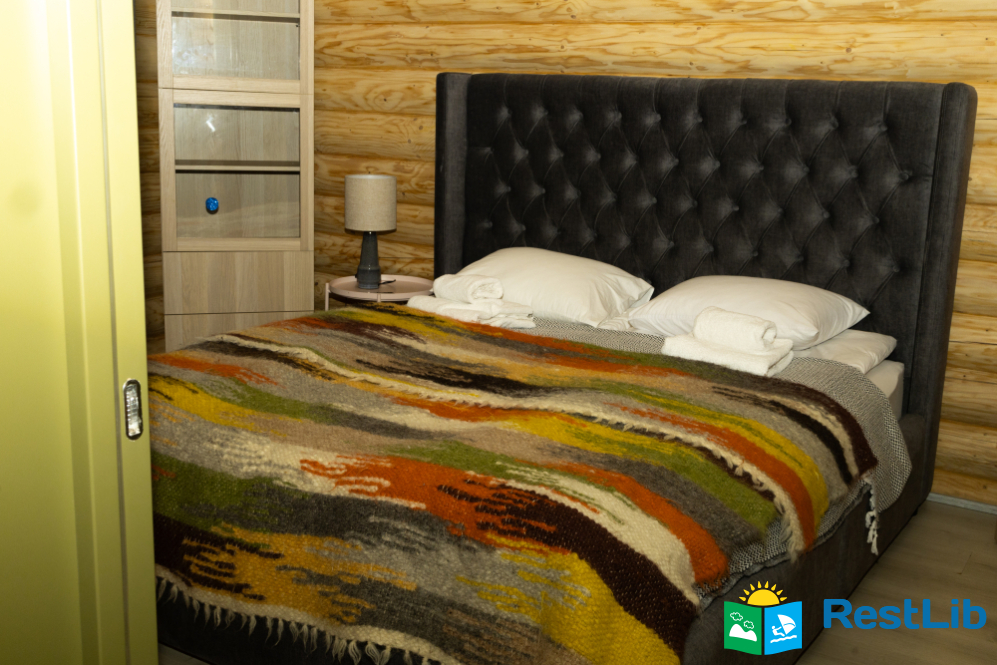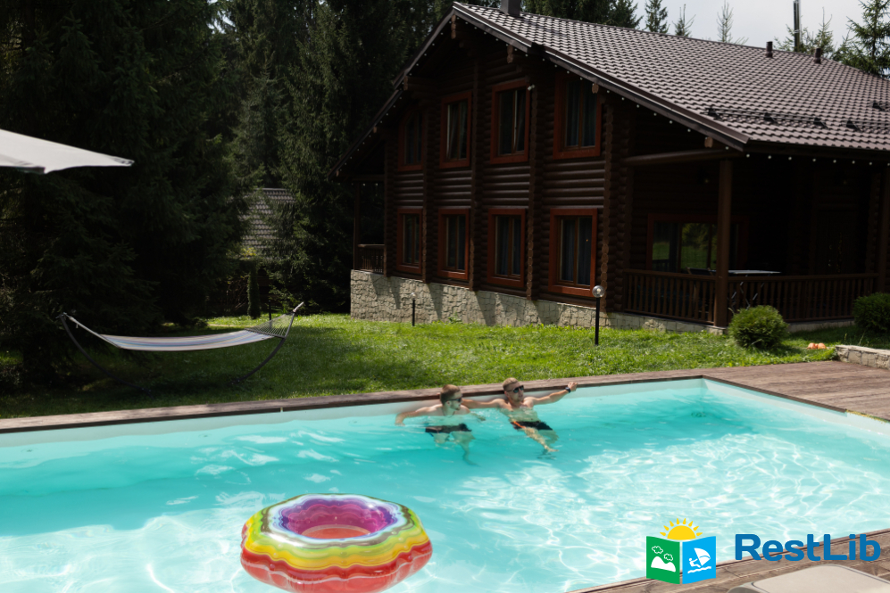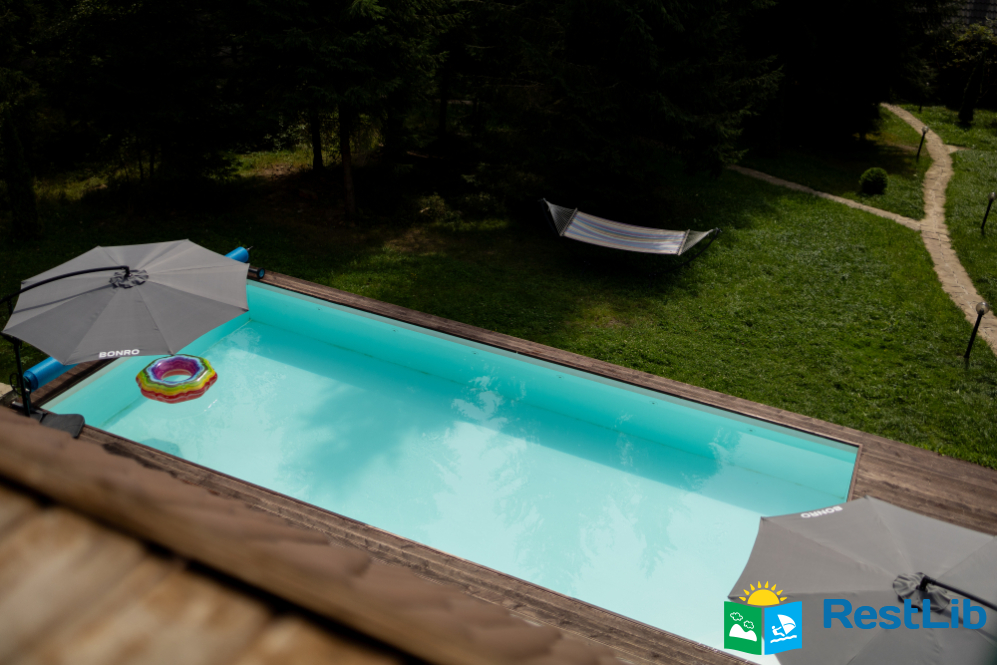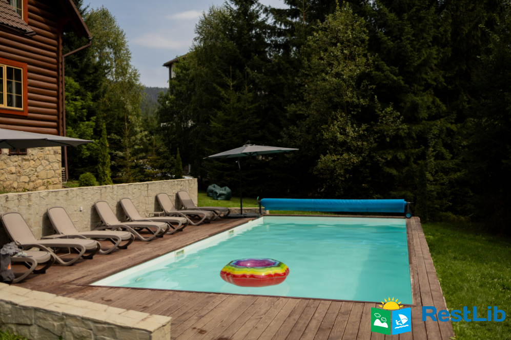 На великій зеленій території розміщені 4 котеджі з натурального зрубу на загальну кількість 42-50 людей, басейн з підігрівом, альтанка з мангалом, лазня із зоною відпочинку, дитячий ігровий майданчик, парковка (під відеоспостереженням).